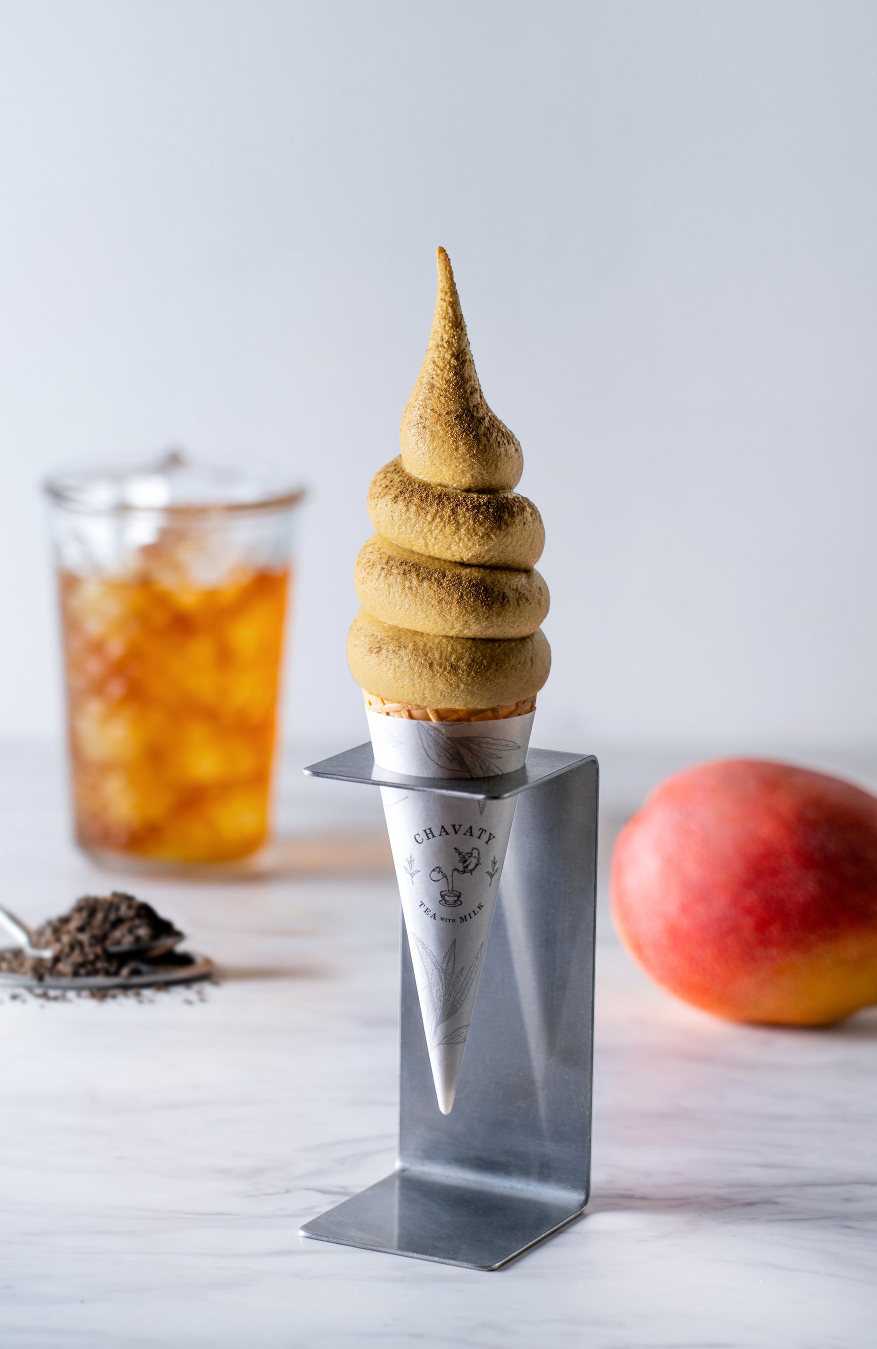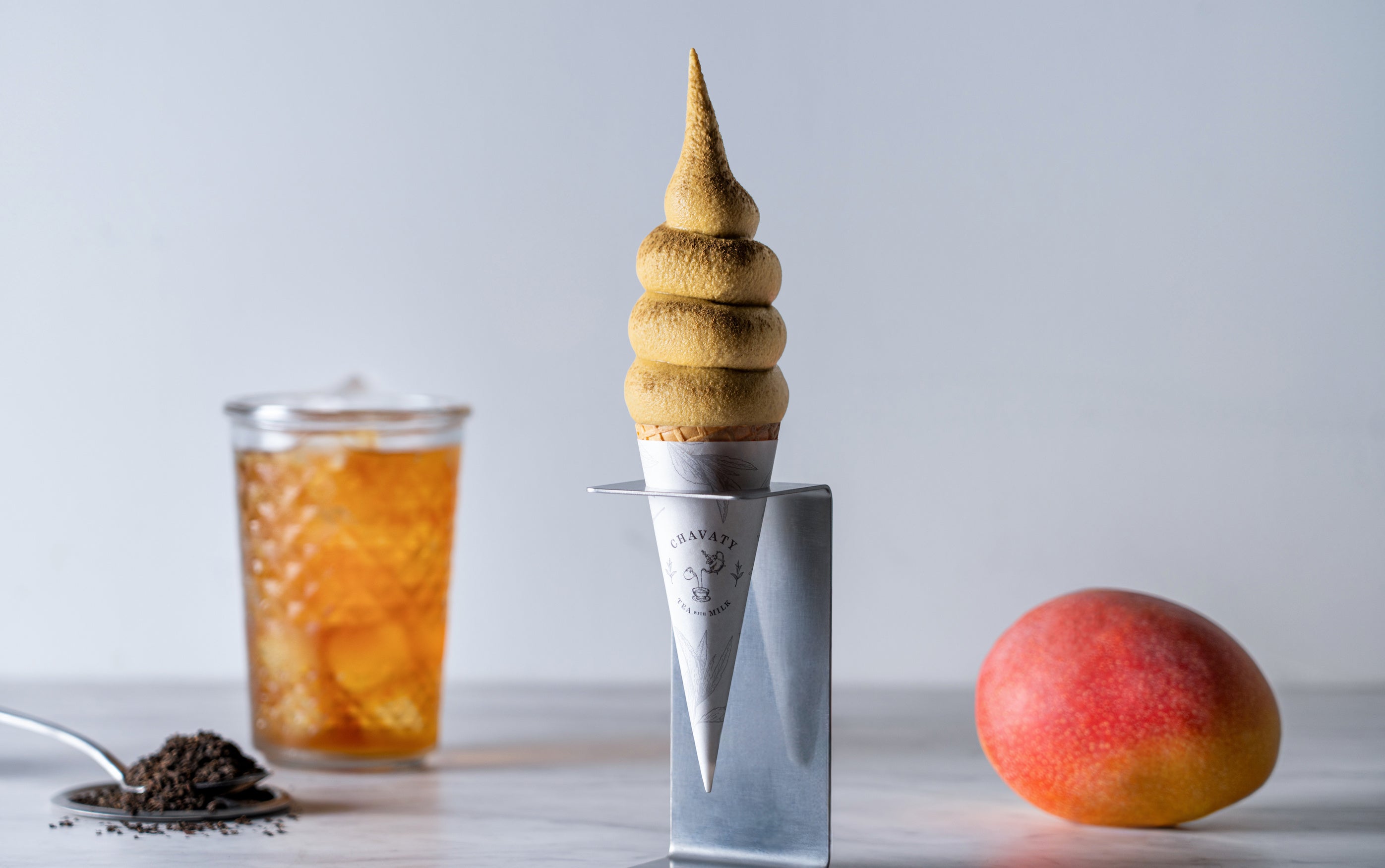 宮崎県の温暖な気候で育てられた、太陽の恵みたっぷりの「宮崎マンゴー」は、濃厚な甘みにとろけるような食感とジューシーな果汁感、強く鮮やかな色味や、華やかな香りなど、贅沢な味わいを楽しむことができる、ブランドマンゴーとして人気を博しており、中でも高品質な完熟マンゴーは希少な果実です。CHAVATYでは、この希少な宮崎マンゴーを皮ごと丸ごと裏漉し、濃厚な甘みと独特のとろけるような食感を堪能できるよう素材を生かしながら、セイロン・ウバと合わせ、CHAVATYオリジナルのティーソフトクリームに仕上げました。ウバはスリランカを代表する紅茶の一つで、特有の爽快な渋みに豊かに香る爽やかなフレーバーが特徴の、強い味わいを持つ紅茶で、茶葉をまるごと粉砕して使用しているため、素材本来の香りと味わいを堪能していただけます。また、「マンゴー&ウバティーソフトクリーム」は、ウバの爽快感を生かしながら、マンゴーのフルーティーさを引き立たせるよう、絶妙なバランスで作り上げています。濃厚なマンゴーのとろけるような味わいの後に続く、ウバのすっきりと香りよい口溶けをぜひお試しください。