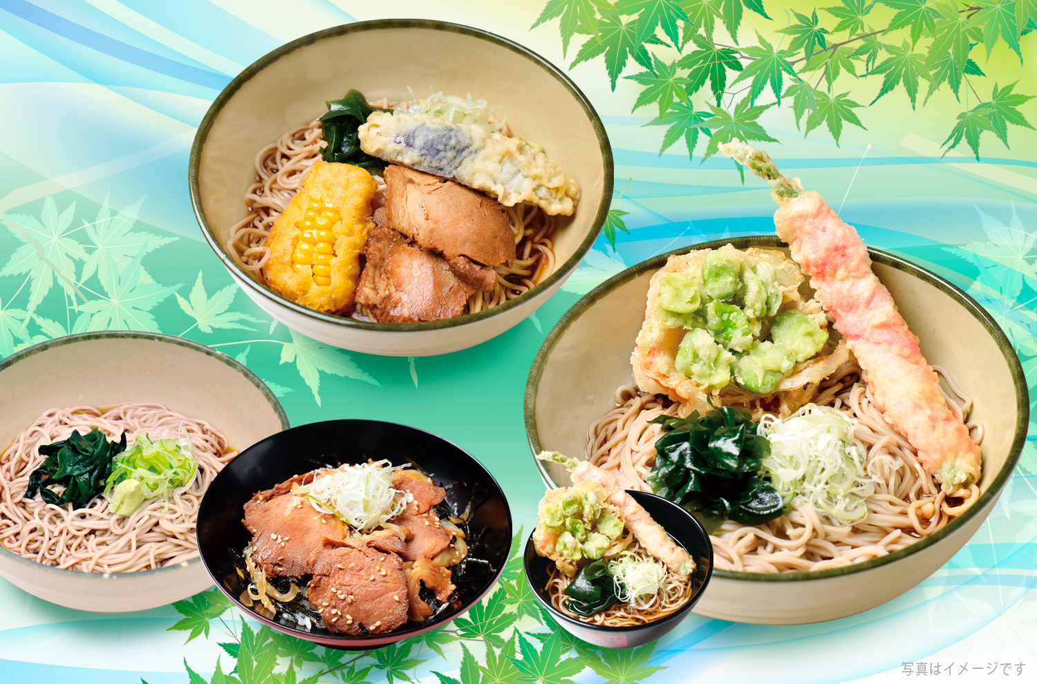 『空豆のミニかき揚げ天とアスパラベーコン巻き天』をはじめ、『豚チャーシューと夏野菜天そば』、『豚チャーシューの肉めし丼セット~ガリバタ風味~』の全3種類をご用意いたしました。是非、ご賞味ください。