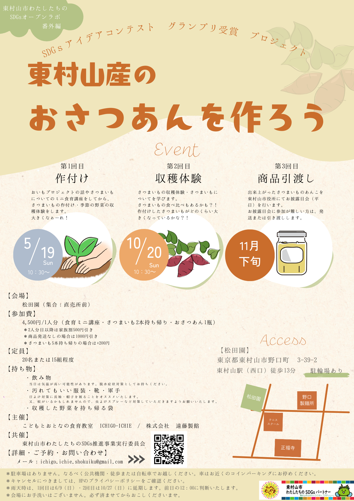 費用に含まれるもの:食育ミニ講座、さつまいも(2本分)、おさつあん(1瓶分)