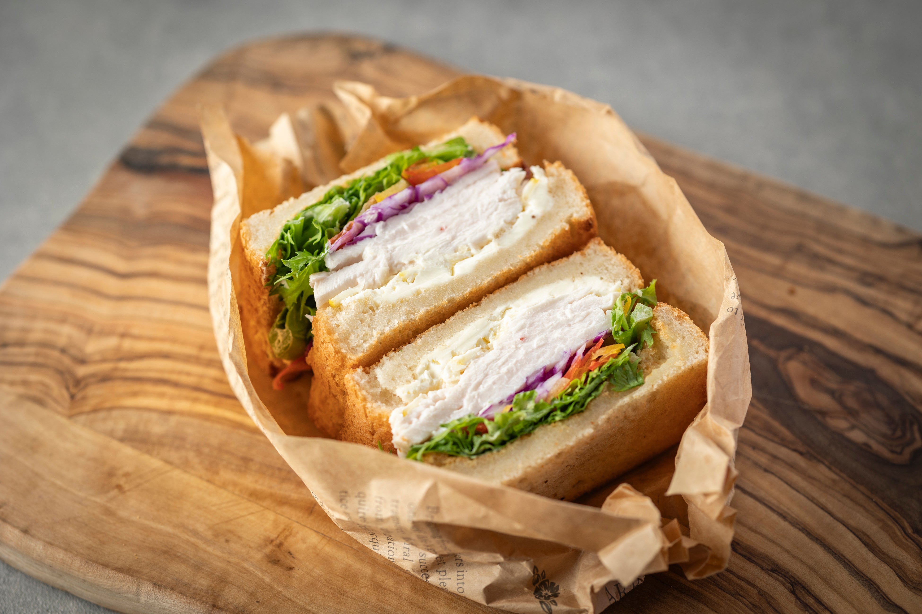 ・特長:玄米粉100%のブレッドを使用した、チキンサンド。香ばしく優しい甘みが特徴のブレッドに、しっとり仕上げたチキンとクリームチーズのコク、フレッシュな野菜がアクセントになった一品。