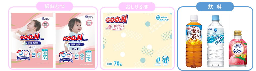 ズ、Lサイズ 各300円)「グーン 肌にやさしいおしりふき 70枚入り」(240円)をダイドードリンコの飲