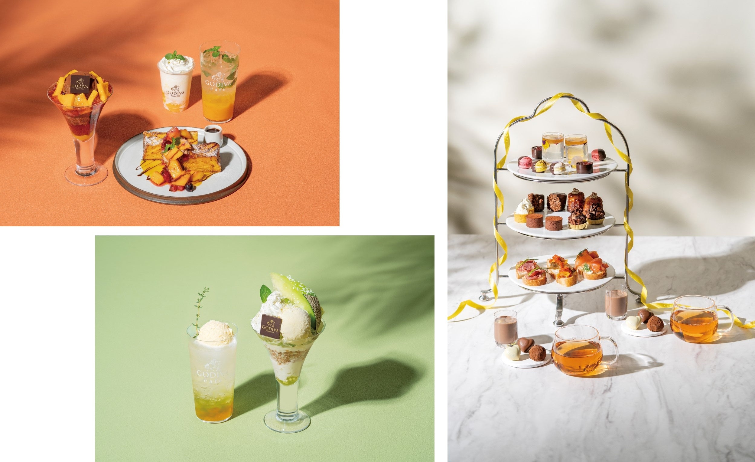 ゴディバのエグゼクティブシェフ・ショコラティエ / パティシエ ヤニック・シュヴォローが監修した、カカオとチョコレートの魅力を存分に堪能いただけるさまざまなデザート、セイボリーが魅力のGODIVA café「アフタヌーンティーセット」。今回は、「マンゴーとハイビスカスのジュレ チョコレートシェル」、「チョコムースとマンゴーのワッフルカップ」、「マンゴーとホワイトチョコムースのタルト」や、「メロンとホワイトチョコムースのタルト」など新メニューを取り揃えてリニューアルしました。コーヒー、紅茶、ハーブティーなどと一緒にお楽しみいただけます。