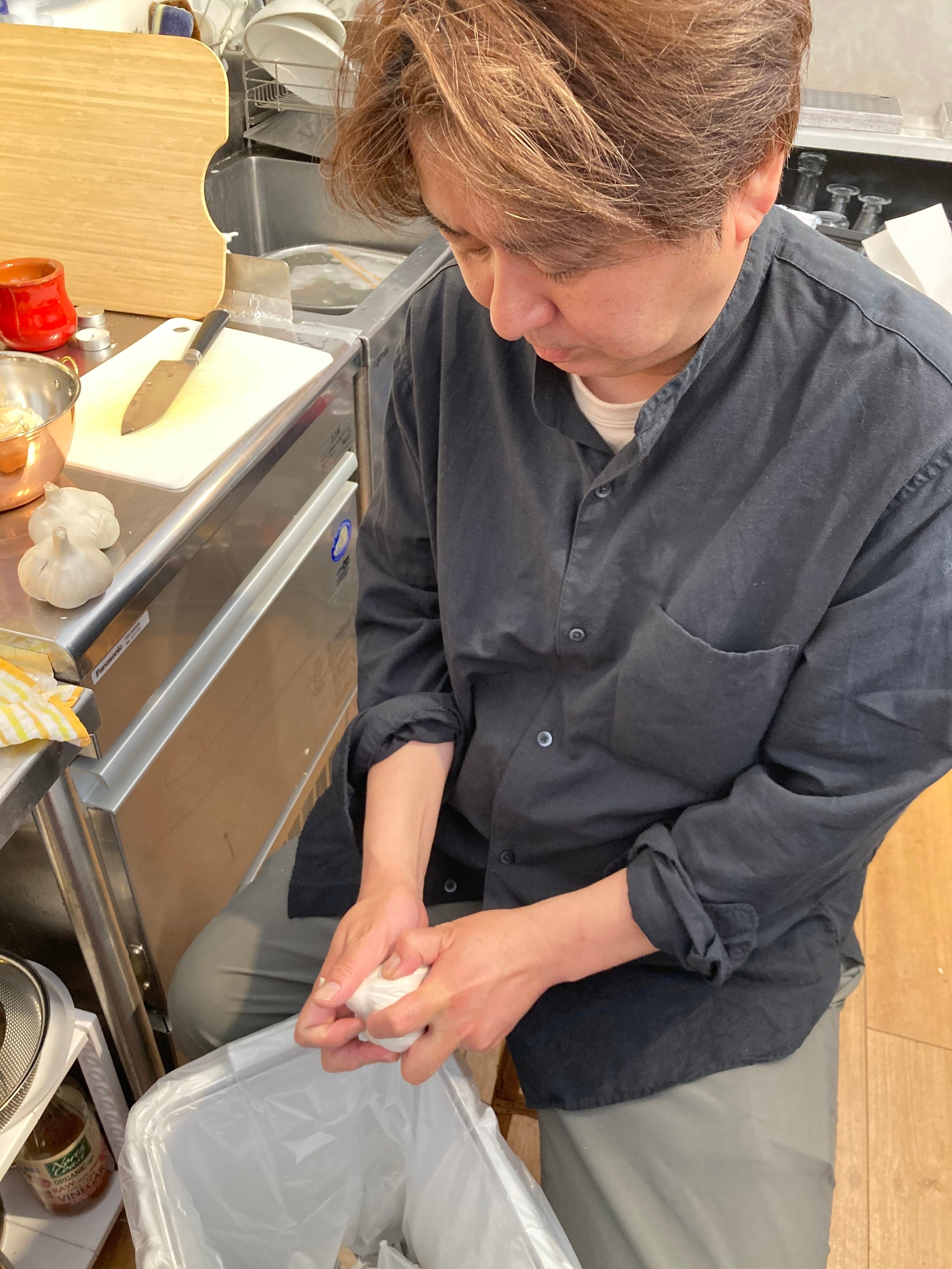 こちらはバーニャカウダソースに使うにんにくの下処理の風景です。