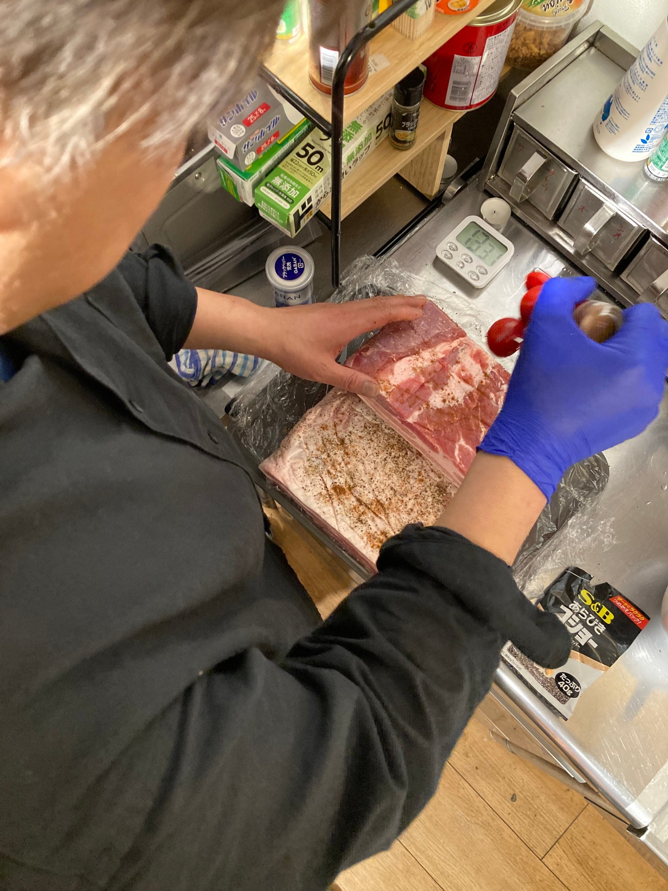 こちらはクラフトビール煮に使う豚肉の下処理中です。クラフトビール煮は豚肉と野菜を水を一切使わず、クラフトビールと味付けに必要な調味料だけで作っています。