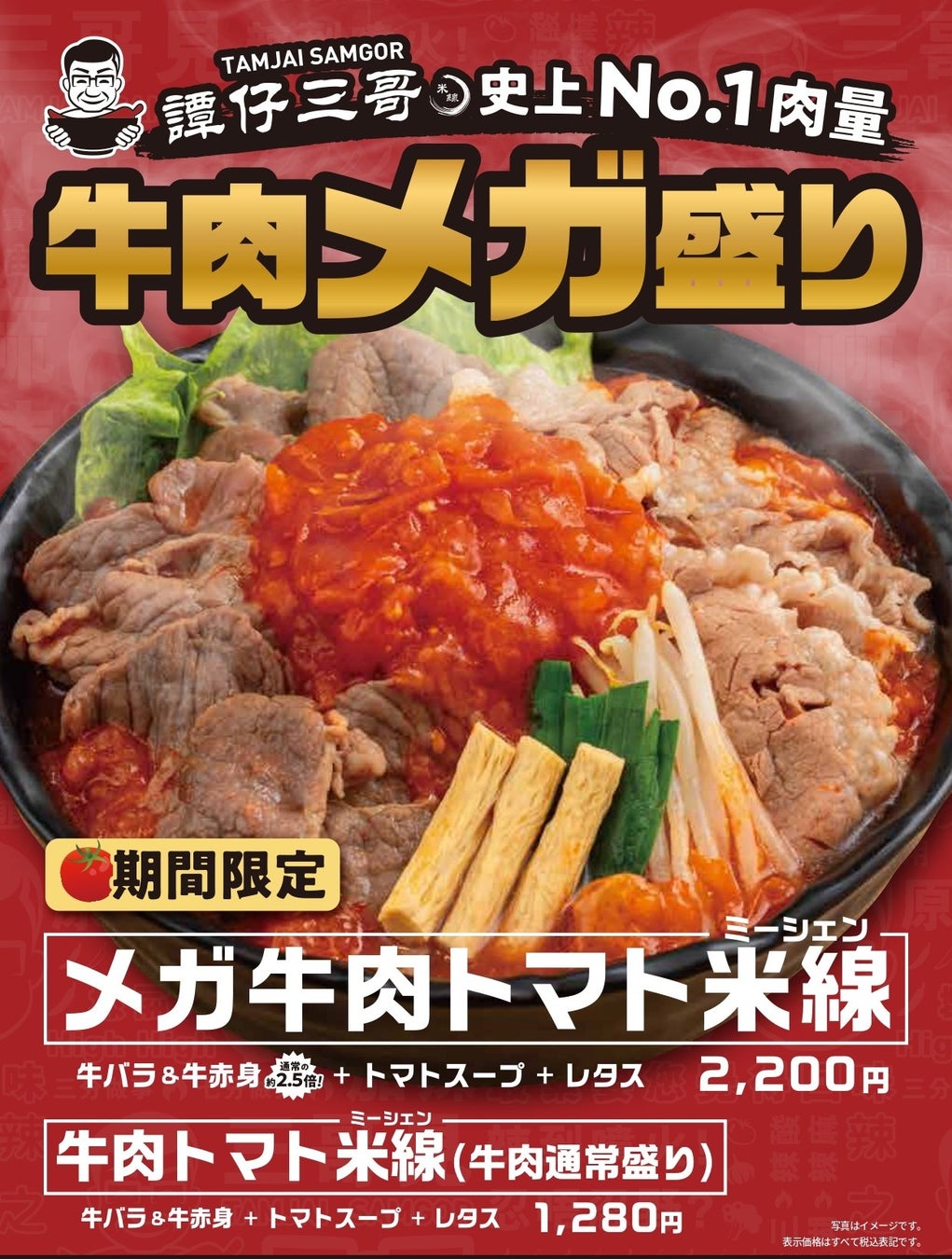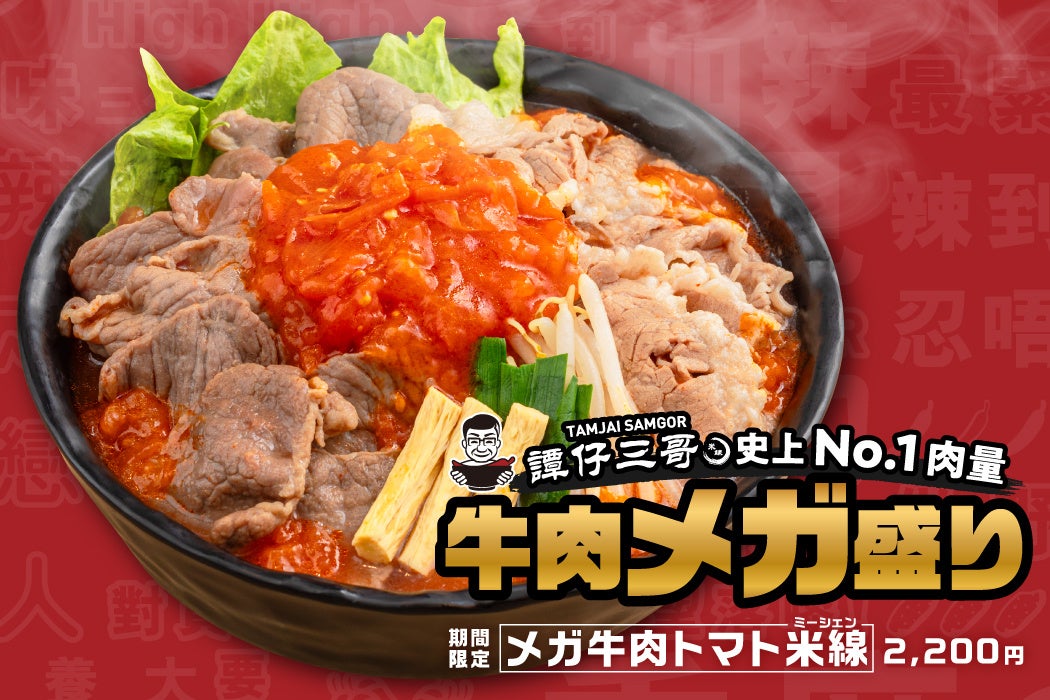 新緑が美しい初夏の訪れを感じる5月に、タムジャイサムゴーから相性抜群“トマト×牛肉”のコラボレーションが実現した期間限定メニューとして「メガ牛肉トマト米線 (ミーシェン)」が登場します。程よいトマトの酸味とたっぷり牛肉の旨味、レタスの食感がバランスよく共存し、女性はもちろん、辛さが苦手な方や老若男女を問わずおすすめの期間限定メニューです。また、タムジャイサムゴー史上No.1の肉量となる牛肉とたっぷりの米線(ミーシェン)により、タムジャイファンは必見・必食の逸品に仕上がっています。