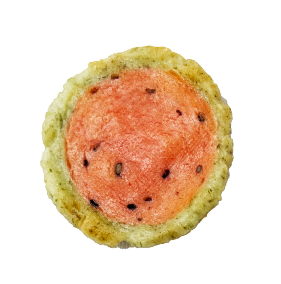パッケージを開けると、ちいさくてかわいいすいか型のあられがざくざく。米菓ですいかという一見アンマッチな取り合わせは、あられで夏を感じていただきたいという遊び心から生まれました。米菓ゆえにすいか果汁は無果汁。すいかの皮部分は青海苔、実は海老、種を黒ごまで表現しています。味は素材の味を引き立てるシンプルなサラダ味。歯ごたえの良い本格あられです。