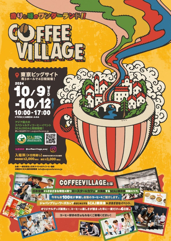 スペシャルティコーヒーの啓蒙・普及を目的とした一般社団法人日本スペシャルティコーヒー協会(所在地:東京都港区、会長:加藤 慶人、以下SCAJ)は、2024年10月9日(水)~12日(土)東京ビッグサイトにて開催されるアジア最大規模を誇るスペシャルティコーヒーコーヒーイベント「SCAJ ワールド スペシャルティコーヒー カンファレンス アンド エキシビション2024(以下SCAJ 2024)」のコンテンツの一つ、マイクロロースターやカフェが集う「Coffee Village」の出展者を本日2024年5月15日(水)から6月28日(金)まで募集いたします。