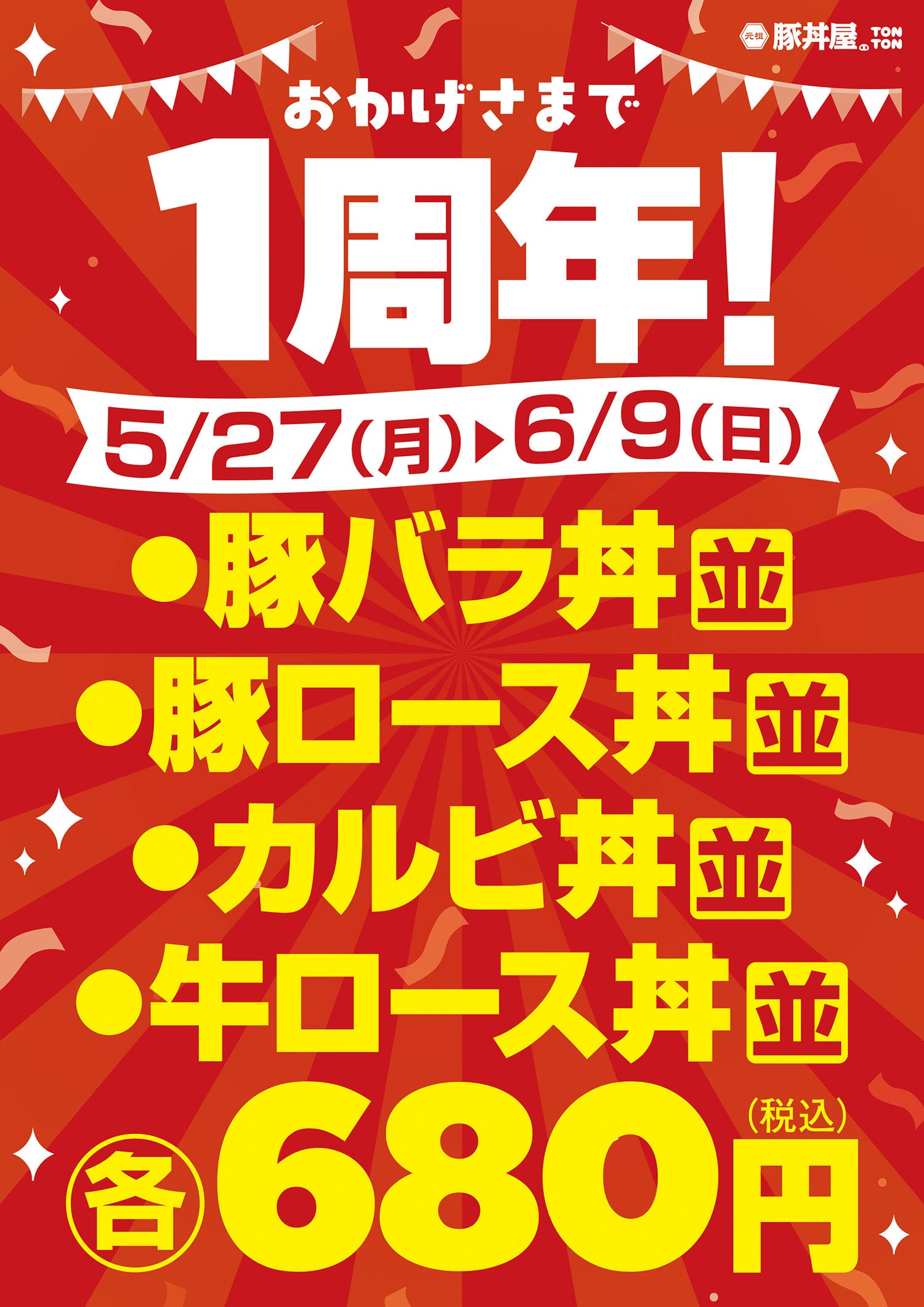 『元祖豚丼屋TONTON 六本松駅前店』では、1周年を記念して、5月27日(月)〜6月9日(日)の間、人気の各種丼を、それぞれ680円(税込)で提供いたします。