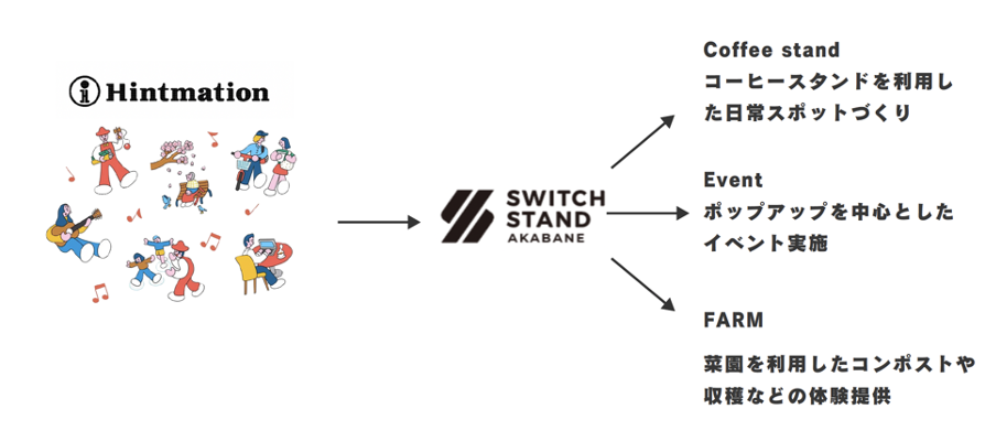 『SWITCH STAND AKABANE』は多機能型コミュニティ拠点『Hintmation』の“なんでもない日に、世界が広がるきっかけを”という想いに寄り添い、コーヒースタンドとしての役割だけでなく、イベントの実施や菜園の運営などを通して、この土地の皆様の暮らしに必要なコーヒースタンドとなれるように運営していきます。