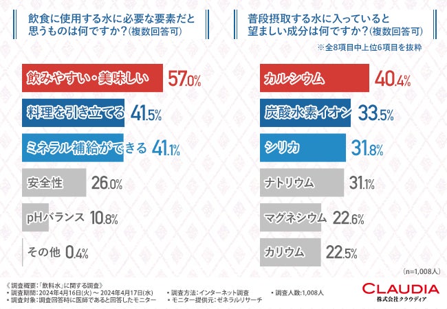 「飲食に使用する水に必要な要素だと思うものは何ですか?(複数回答可)」と質問したところ、『飲みやすい・美味しい(57.0%)』と回答した方が最も多く、次いで『料理を引き立てる(41.5%)』『ミネラル補給ができる(41.1%)』と続きました。