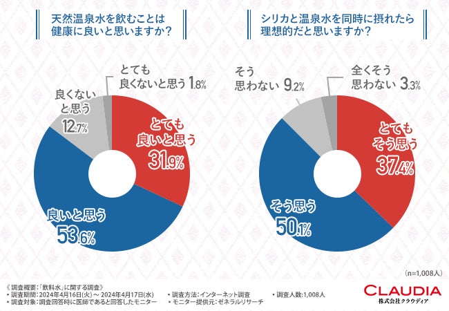 さらに、8割以上が天然温泉水を飲むことは健康に良いと回答し、シリカと天然温泉水を同時に摂取できるのが理想的だと思う方が非常に多いようです。