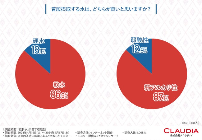 その結果、8割以上の方が普段摂取する水として、それぞれ『軟水(86.9%)』『弱アルカリ性(87.1%)』と回答したことが示されました。