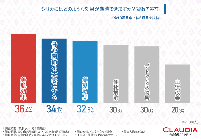 シリカには美肌効果を期待できると回答した方が3割以上おり、また、骨や関節を丈夫にすることや美髪効果などが期待できるようです。