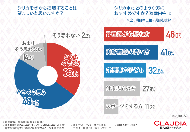 そこで、「シリカを水から摂取することは望ましいと思いますか?」と質問したところ、8割以上の方が『とてもそう思う(35.1%)』『ややそう思う(48.5%)』と回答しました。