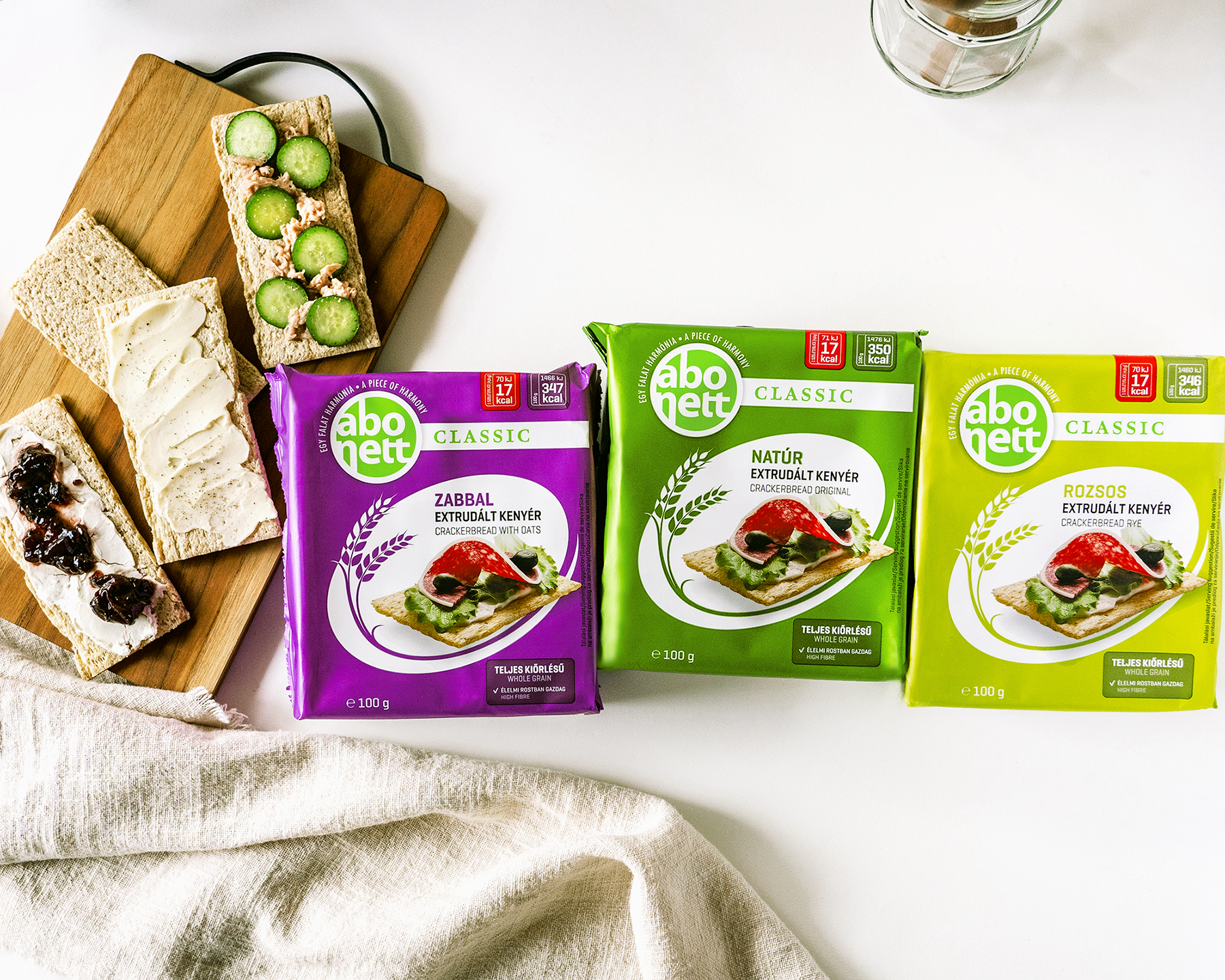 1986年に誕生して以来、ファミリービジネスで続くハンガリー・アボニー発のフラットブレッドブランド。トーストのように活用でき、長期保存ができていつでもどこでも食べることができる〈クラッカーブレッド〉は、挽きたての全粒穀物粉を加熱加圧・押出成形することでノンフライ・ノンオイル・低カロリーを実現。原材料は地元ハンガリーから仕入れ、環境に配慮された加工技術により製造。手軽に食物繊維やたんぱく質を採ることができ、忙しいライフスタイルにも提案できる低カロリーでヘルシーなアイテムを提供しています。ハンガリーではブランド名である「アボネット」が押出成形されたフラットブレッドの代名詞となっており、マーケットリーダーとして認知を獲得している他、国外では現在、ヨーロッパをはじめ25ヵ国で楽しまれています。
