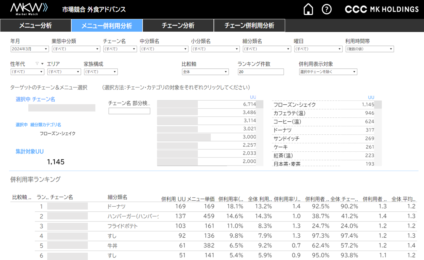 ②メニュー併利用分析:選択したメニューの併用ランキング