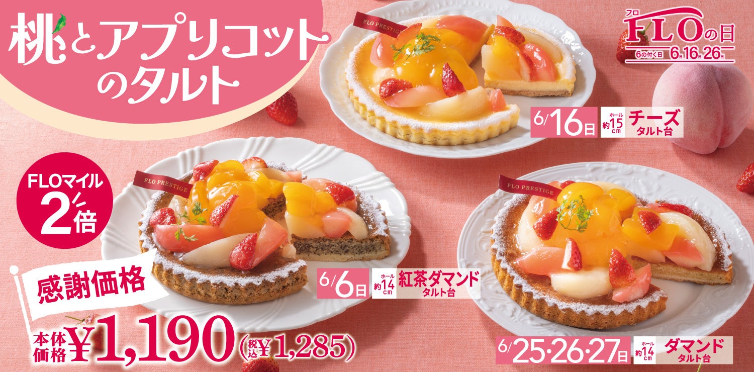 好評につき、継続決定!5月に続き、甘酸っぱいアプリコットと優しい甘さの2色の桃をたっぷりのせた直径約14~15cmのホールタルトを、FLOの日限定価格・税込1,285円で販売いたします。