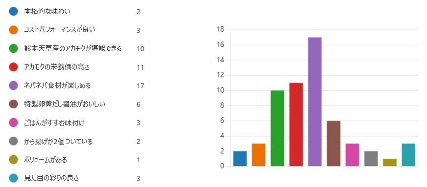 最も多くの票を集めたのは『ネバネバ食材が楽しめる』というポイントでした。2位は『アカモクの栄養価の高さ』、3位は『熊本天草産のアカモクが堪能できる』でした。