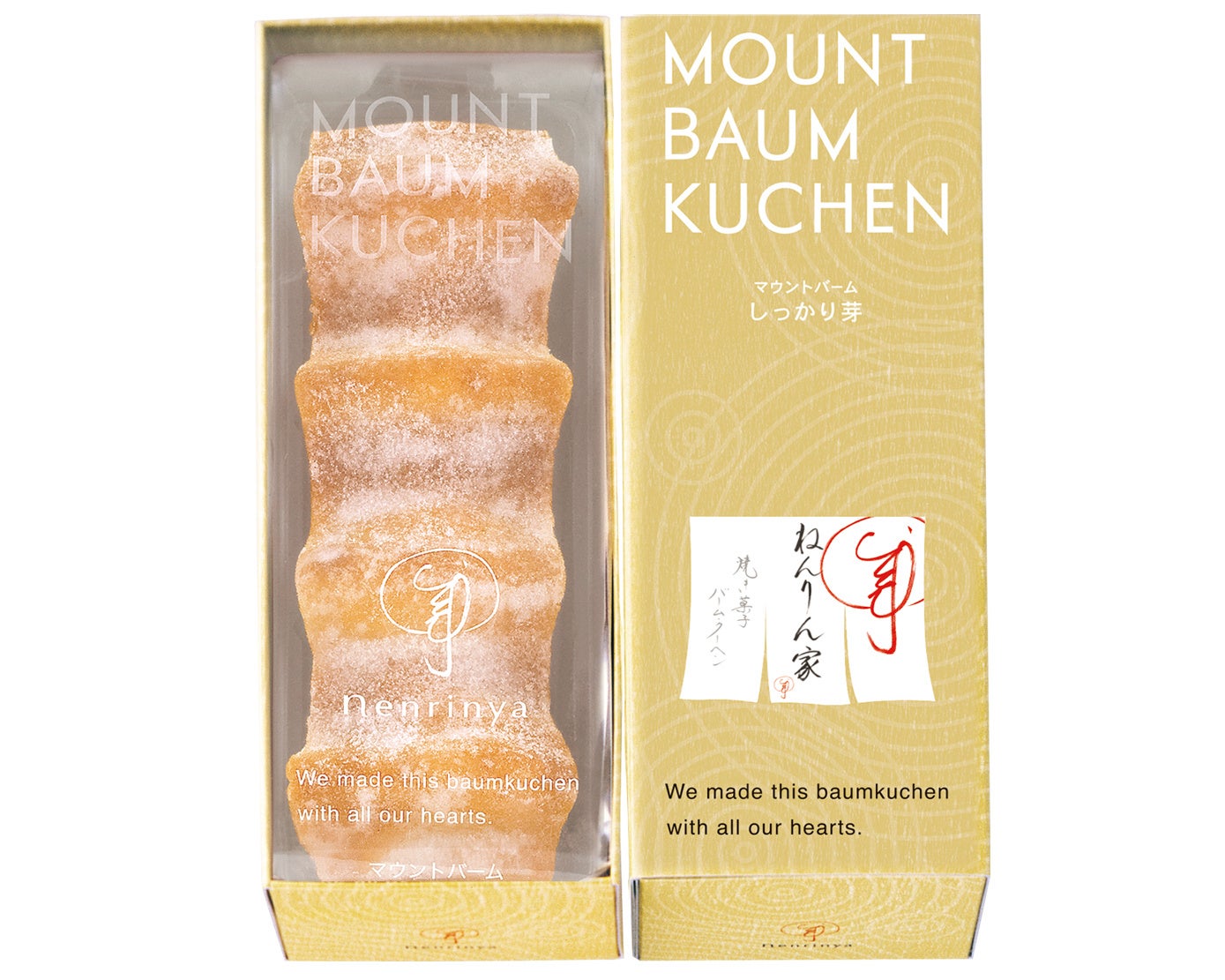 ねんりん家の代表作。⽪はカリッ、中はしっとり熟成の「マウントバーム しっかり芽」。濃厚なバター⾵味の⽣地を、独⾃の窯で⻑時間じっくり焼きあげておいしさを引き出した、こだわりのバームクーヘンです。