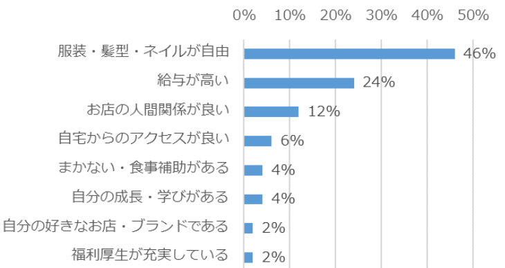 まず、飲食店でアルバイトを探す時に最も重要な条件について聞いたところ、最も多い回答は、「服装・髪型・ネイルが自由」(46%)、次いで「給与が高い」(24%)、「お店の人間関係が良い」(12%)という結果になりました。