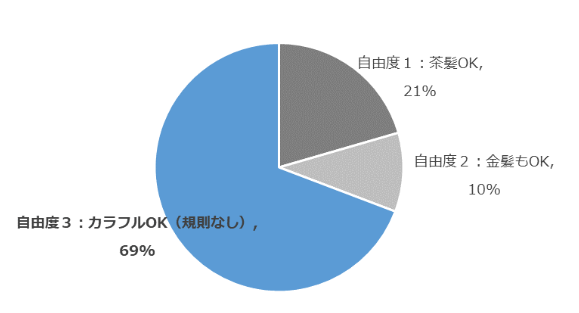 ヒゲ、タトゥーについて自由度を求める人は少ないものの、ネイル、髪色、ピアスについては半数以上が自由度を求めていることがわかります。