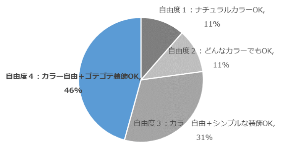 特に髪色とネイルについては、「カラフルOK(規則なし)」(54%)や「カラー自由+ゴテゴテ装飾OK」(32%)というように、色や装飾までも自由であることを希望している人が最も多い結果となりました。