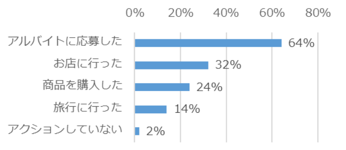 最後に、TikTok, Instagramを見てどんなアクションを取ったことがあるかについて聞いたところ、「アルバイトに応募した」(64%)が最も多く、「お店に行った」(32%)、「商品を購入した」(24%)という結果になりました。TikTok, Instagramを通じて一定のアクションを起こしていることが見て取れます。