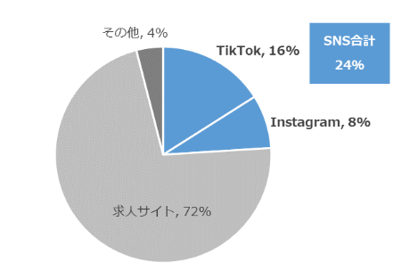 続いて、アルバイト探しで最も使っているツールについて聞いたところ、最も多かったのは、「求人サイト」(72%)で、次いで「TikTok」(16%)、「Instagram」(8%)という結果になりました。