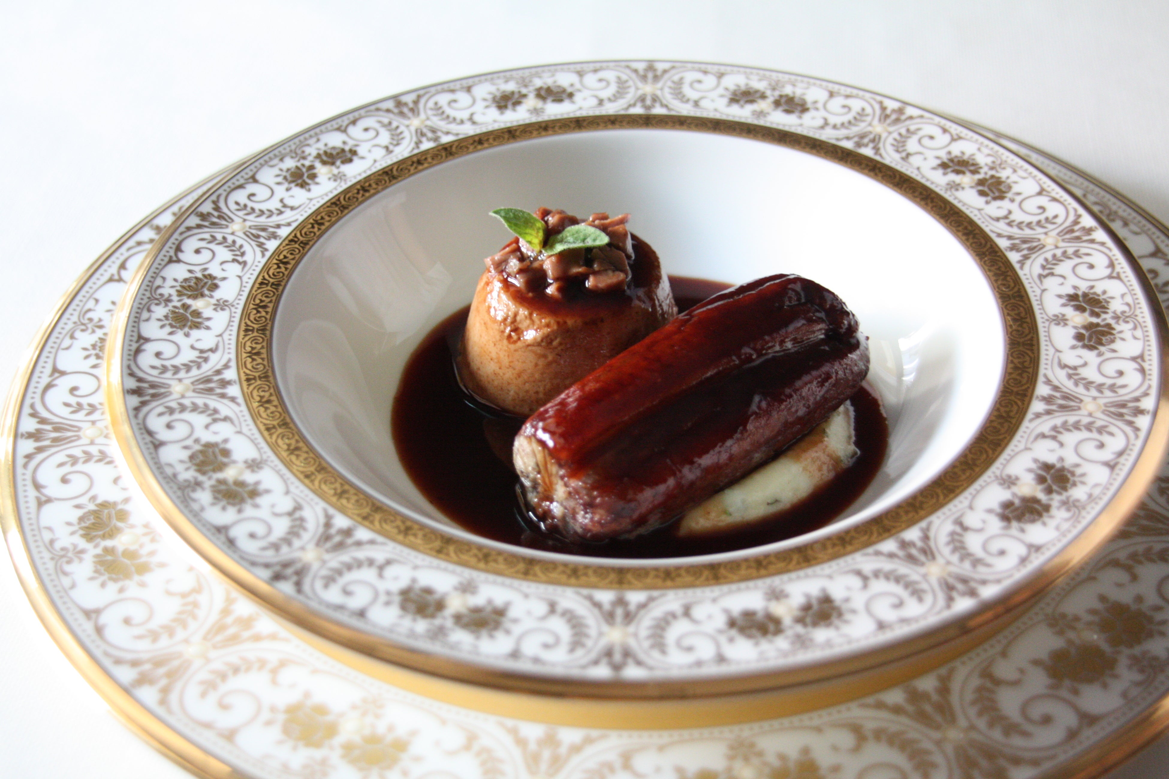 ■夏鹿の赤ワイン煮込み タイムの香り キャビア ドーベルジーヌ、ヴァンジョーヌとモリーユ茸のクロゼを添えて