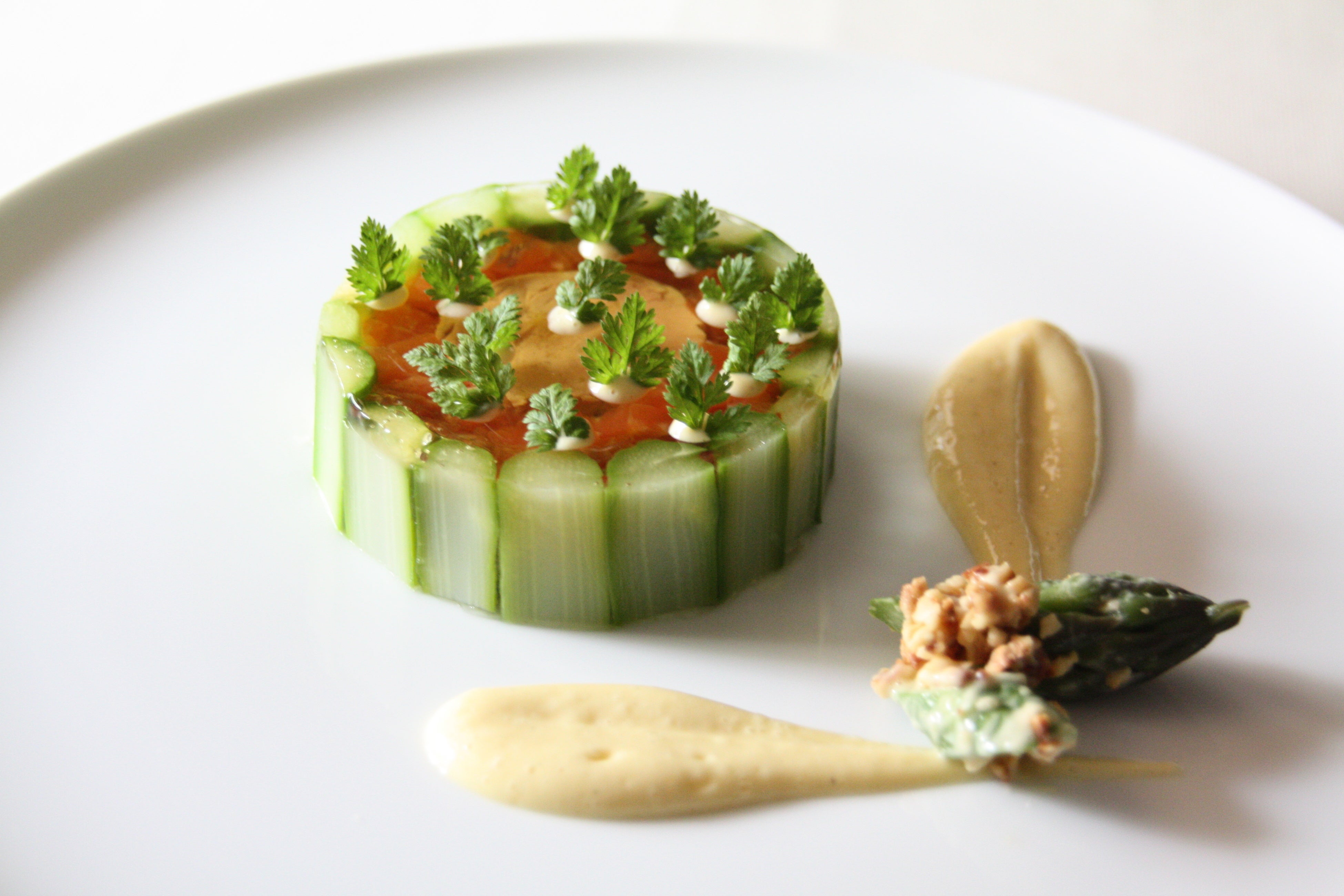 「アスパラガスとフォアグラのアスピック」は、新鮮なアスパラガスとクリーミーな味わいのフォアグラを組み合わせ、ジュラ地方を代表するワイン「ヴァン・ジョーヌ」を使用した初夏にふさわしい贅沢な逸品です。