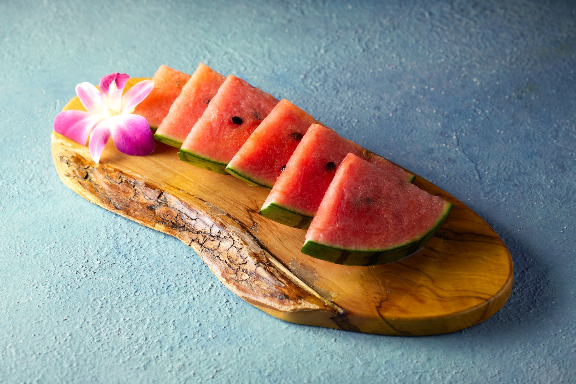 デザートには夏の風物詩であるスイカをご用意いたしました。甘くみずみずしい味わいは暑い夏の日にぴったりです。大きくカットされた新鮮なスイカを豪快にお楽しみください。
