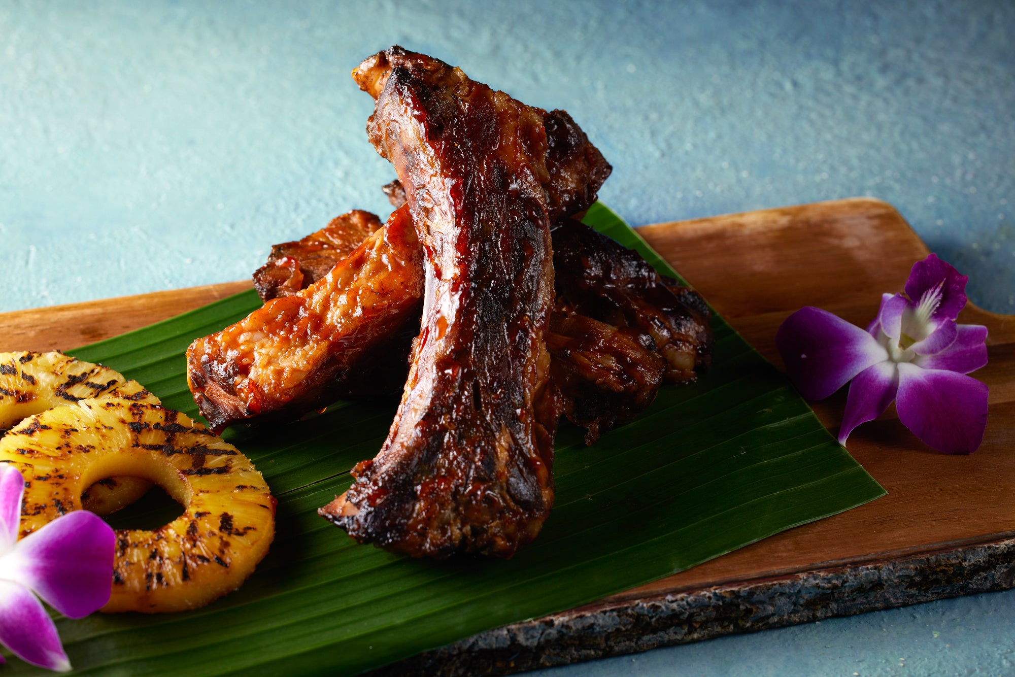 外はカリッと、中はしっとり柔らかな国産豚のスペアリブと、東京の伝統の味噌「江戸甘味噌」などを使ったオリジナルのBBQソースを合わせたボリューム満点のメイン料理です。サイドにはスパイスで味付けされた焼きパイナップルを添え、ハワイの雰囲気を演出しています。