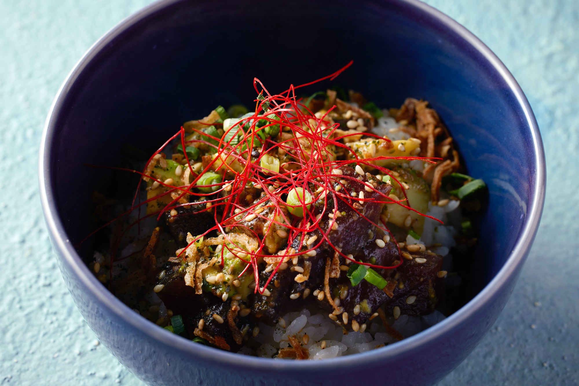 締めの一品はハワイのローカルフードをお楽しみいただけます。マグロとアボカドを小さくサイコロ状にカットし、チリマヨネーズで味付け、八代目儀兵衛の白米にたっぷりと乗せました。ごま油の風味が食欲を掻き立てます。