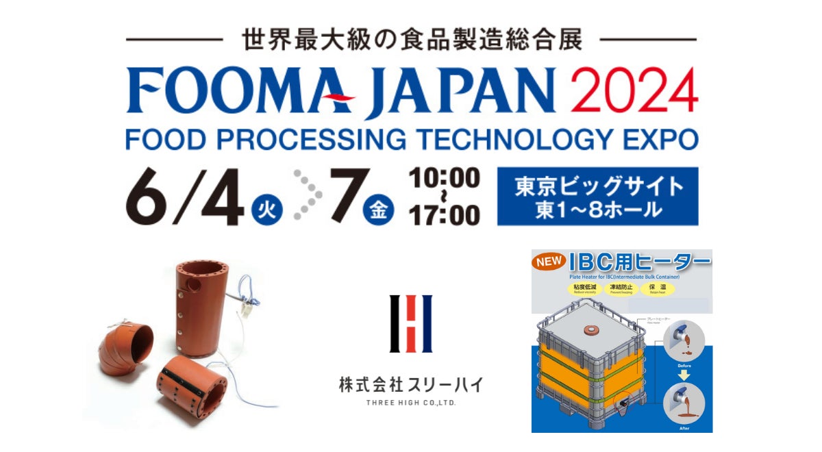 産業用ヒーターを製造・販売する株式会社スリーハイ(本社:横浜市都筑区、代表取締役:男澤 誠 以下、スリーハイ)は、2024年6月4日(火)~7日(金)までの4日間、東京ビッグサイト 東1〜8ホールにて開催される、一般社団法人 日本食品機械工業会主催の世界最大級の食品製造総合展「FOOMA JAPAN 2024」にブースを出展しますので、お知らせいたします。