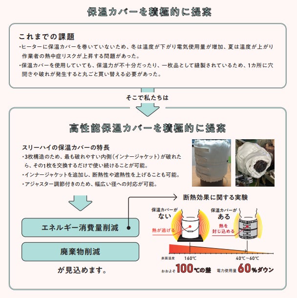 例えば、スリーハイが提案している保温カバーを利用することで、電力使用量が60%ダウンした事例もあります。電力使用量の削減は、同時にCO₂排出量の削減にもつなげることができます。