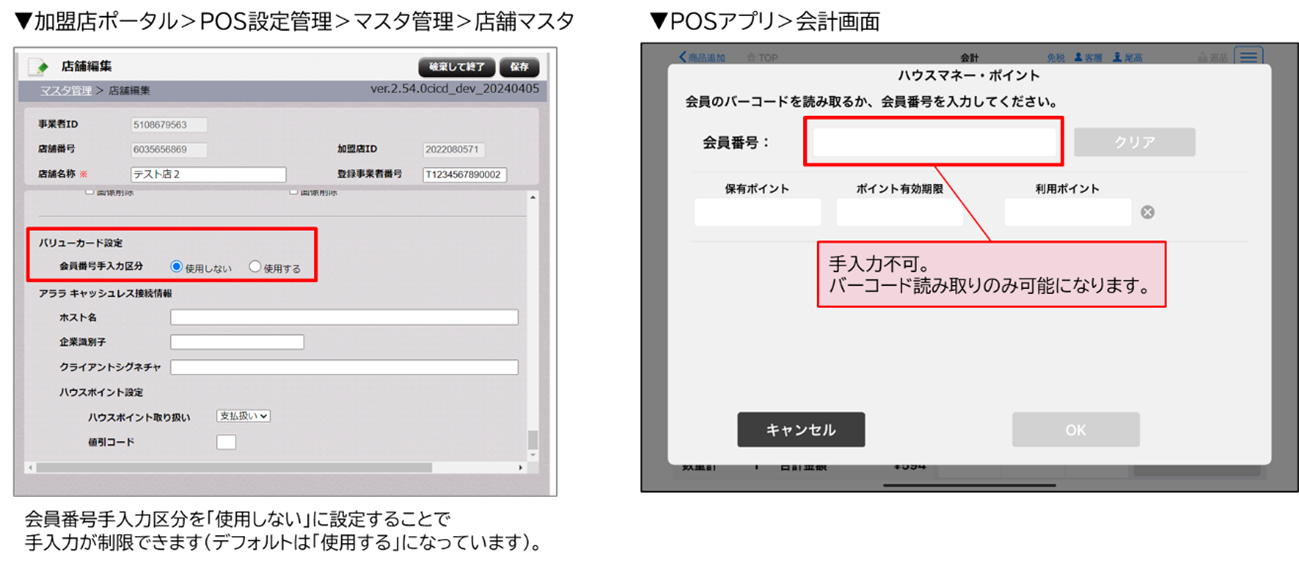 バリューカード連携時にポイントカード番号の手入力を制限(カード番号手入力のON・OFF)できるようになりました。
