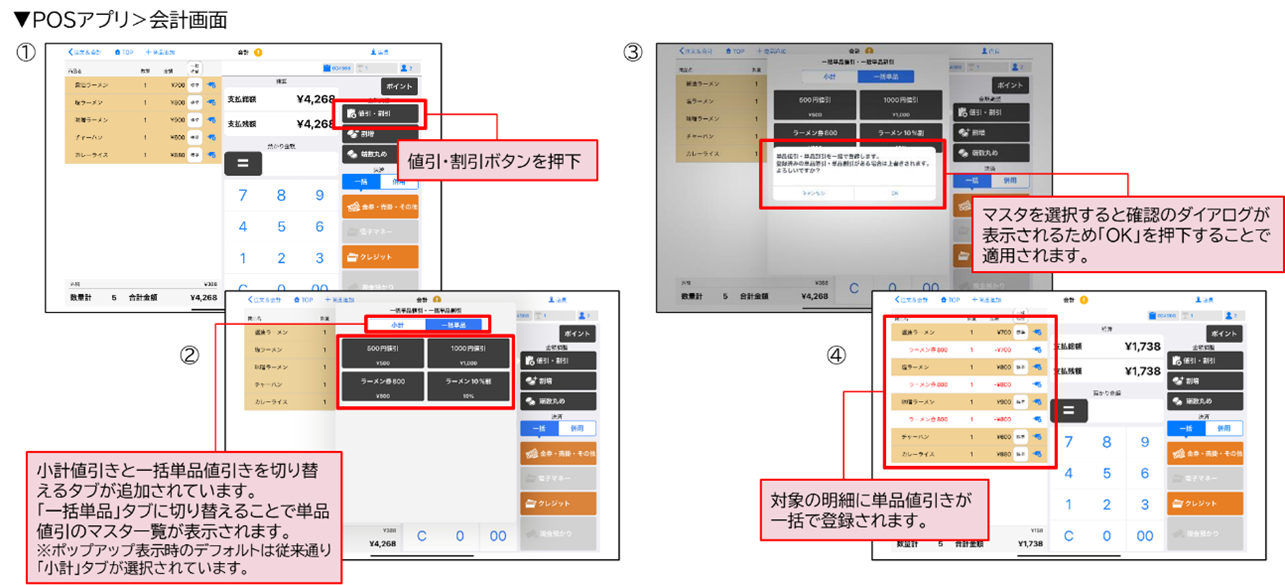 会計画面において単品値割・割引を一括登録できるようになりました。従来の小計値引・割引ボタンから単品値引きも選択でき、対象の明細に適用することができます。値引・割引マスタの「単品値割引可能商品」の紐づけ設定と組み合わせることで、特定の商品群だけに値引きをするなどの運用が可能となります。