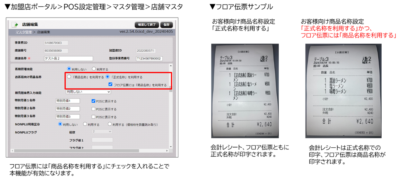 お客様向け商品名称を「正式名称を利用する」に設定した場合でも、フロア伝票を「商品名称」で印字できるようになりました。