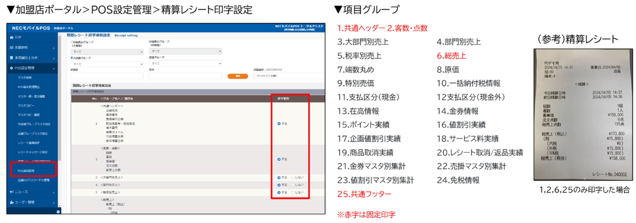 点検精算レシートの印字項目を任意に設定できるようになりました。
