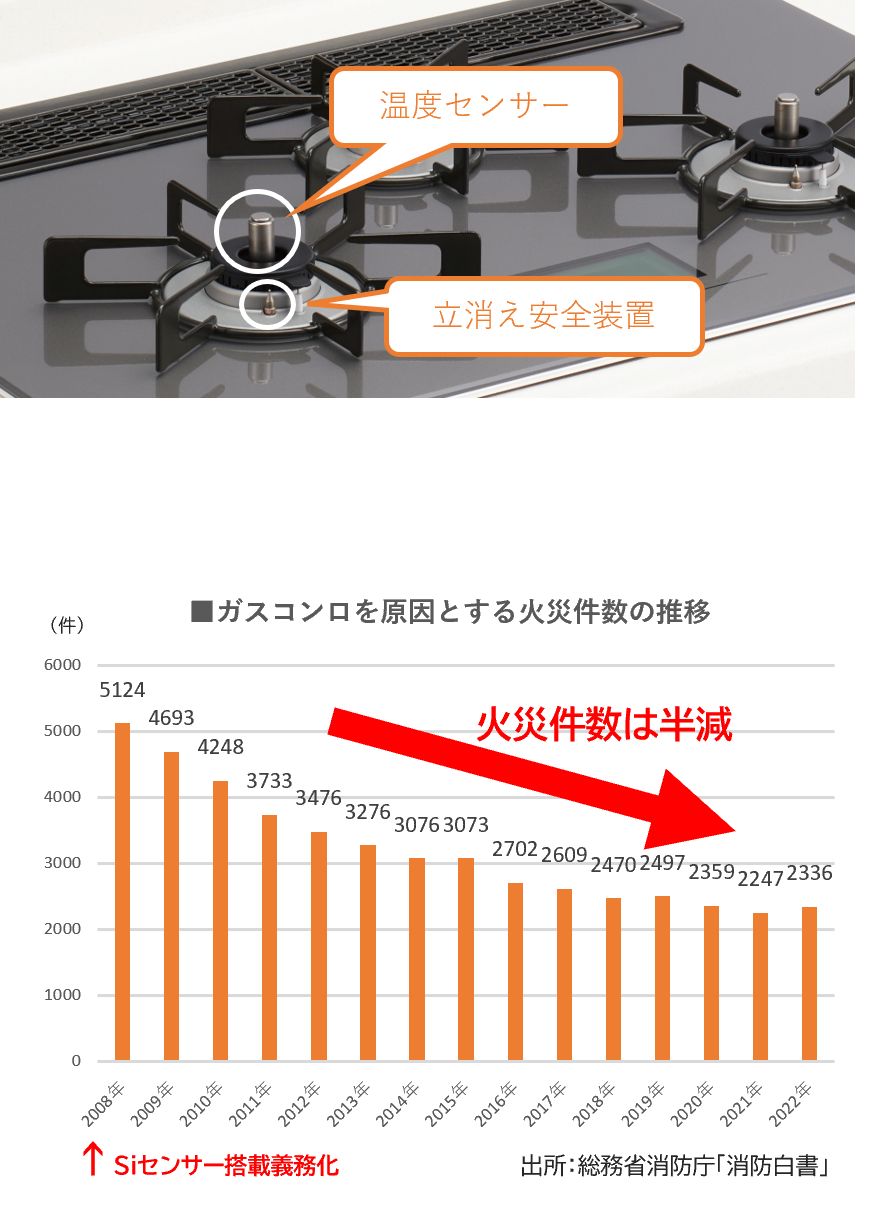 2008年10月以降は家庭用のガスコンロ全口へのSiセンサー搭載が義務化されています。Siセンサーコンロの全国展開により、10年12月には販売台数1000万台、13年9月には販売台数が2000万台に達し、15年3月には2500万台を越えました。Siセンサーコンロの普及に伴い、全国でのガスコンロを原因とする火災が年々減少し、ガスコンロを原因とする火災は、2008年5,124件から2022年2,336件と、半分以上減少しました。