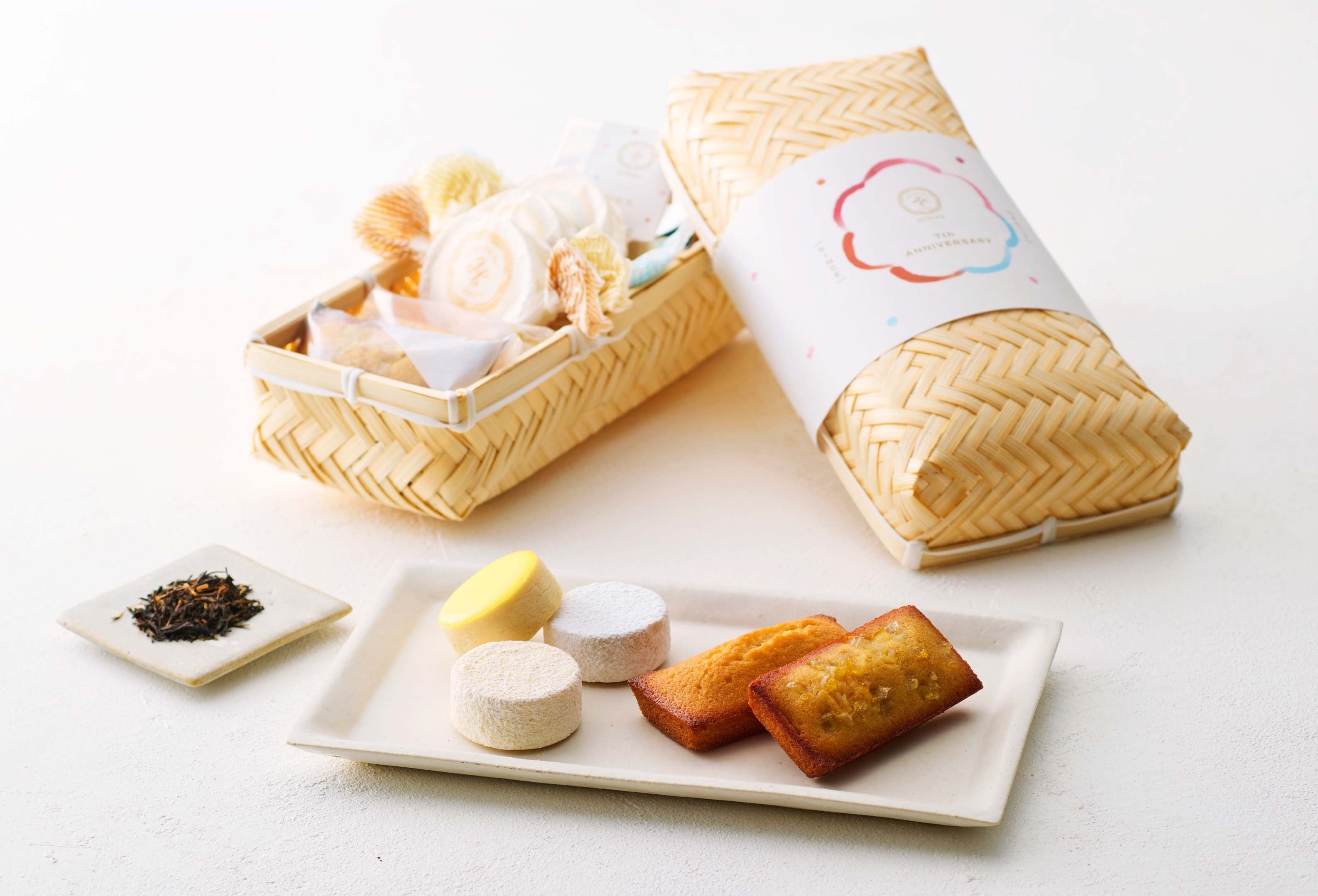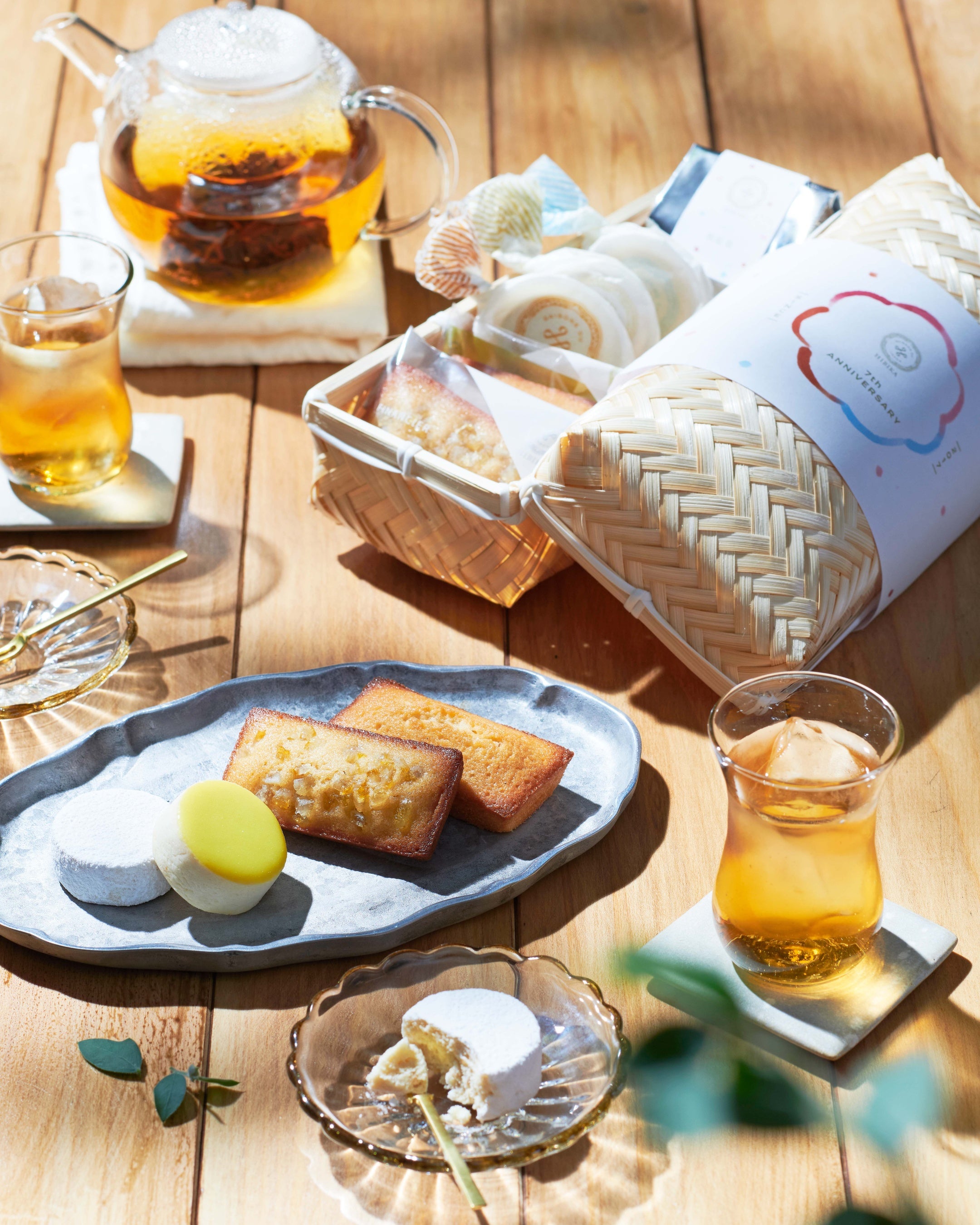 HIBIKA おすすめの焼き菓子と和紅茶の詰め合わせ。お口に入れるとほろほろ溶ける“夏のクッキー(ポルボロン)”と、しっとりとやさしい口当たりの“夏のフィナンシェ”、自然で柔らかな風味の和紅茶をセットにして涼やかな籠に入れた7周年記念ギフトです。