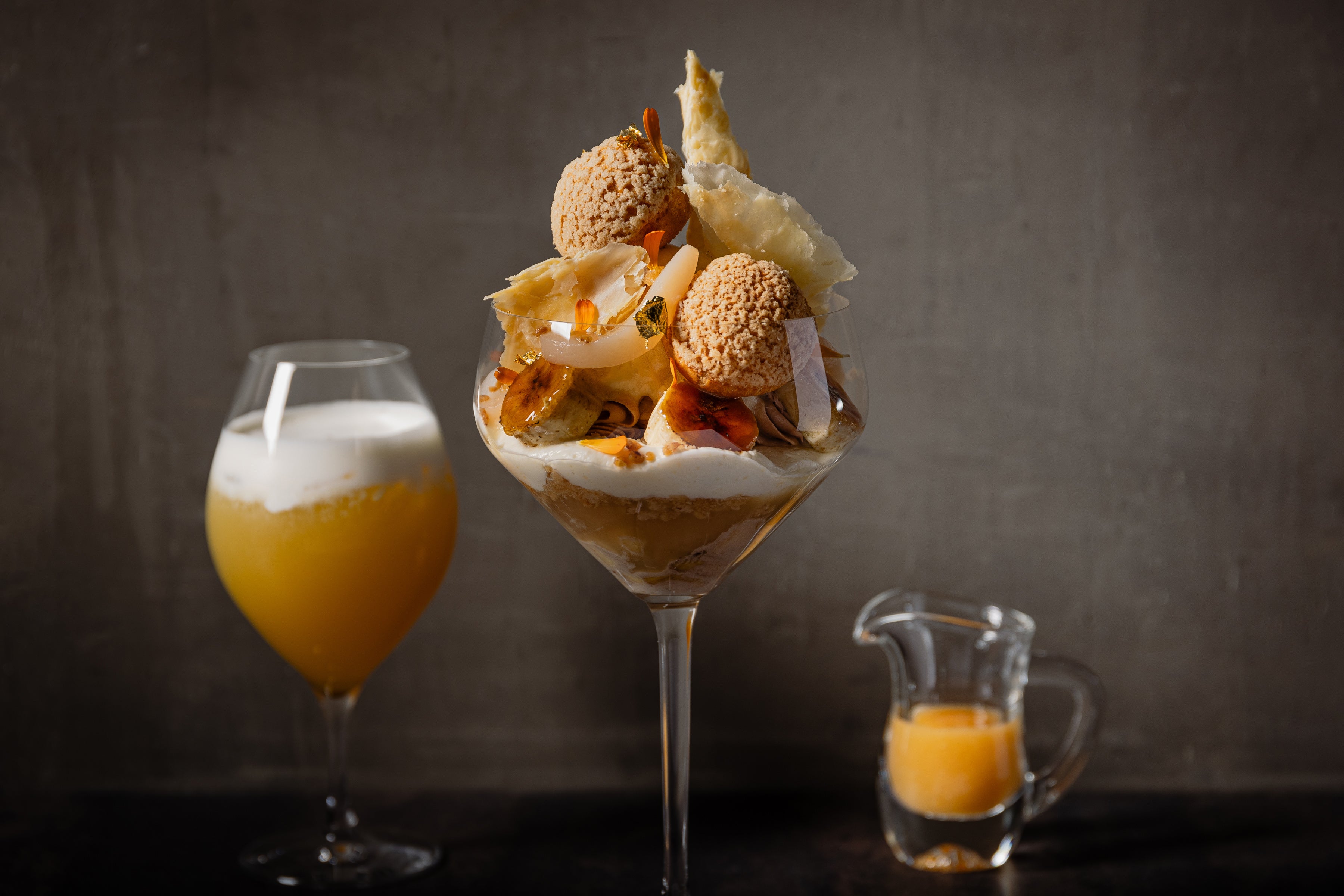 1840年ごろにパリのパティシエによって考案されたシュー生地とパイ生地にクリームを合わせた伝統的なフランス菓子「サントノーレ」にねっとりとしたバナナのパーツや生地、白桃のフレッシュで甘い果実感あるジュレとコンポートを合わせてパフェにリメイクしました。ザクザク、カリカリ、ふわふわと巡る食感にバナナと白桃のソースをかけて上品な香りにどこか馴染みある懐かしい味わいをお楽しみください。