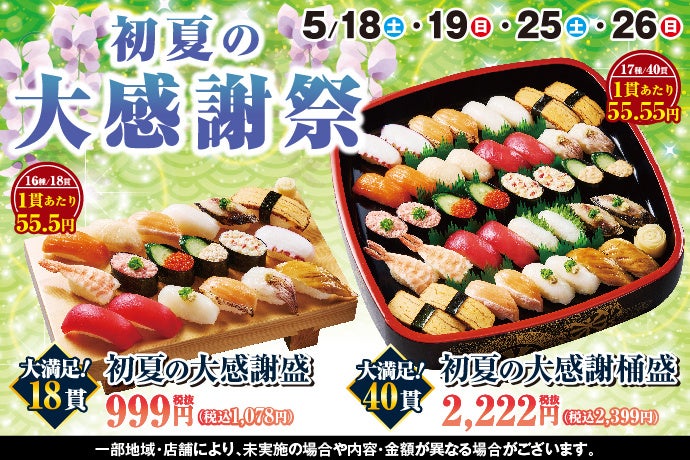 持ち帰り寿し店の「⼩僧寿し」「茶⽉」を運営する株式会社⼩僧寿しは、持ち帰り寿し店「⼩僧寿し」にて、5月18日(土)~19日(日)・25日(土)~26日(日)の期間限定で「初夏の大感謝祭」を開催します。