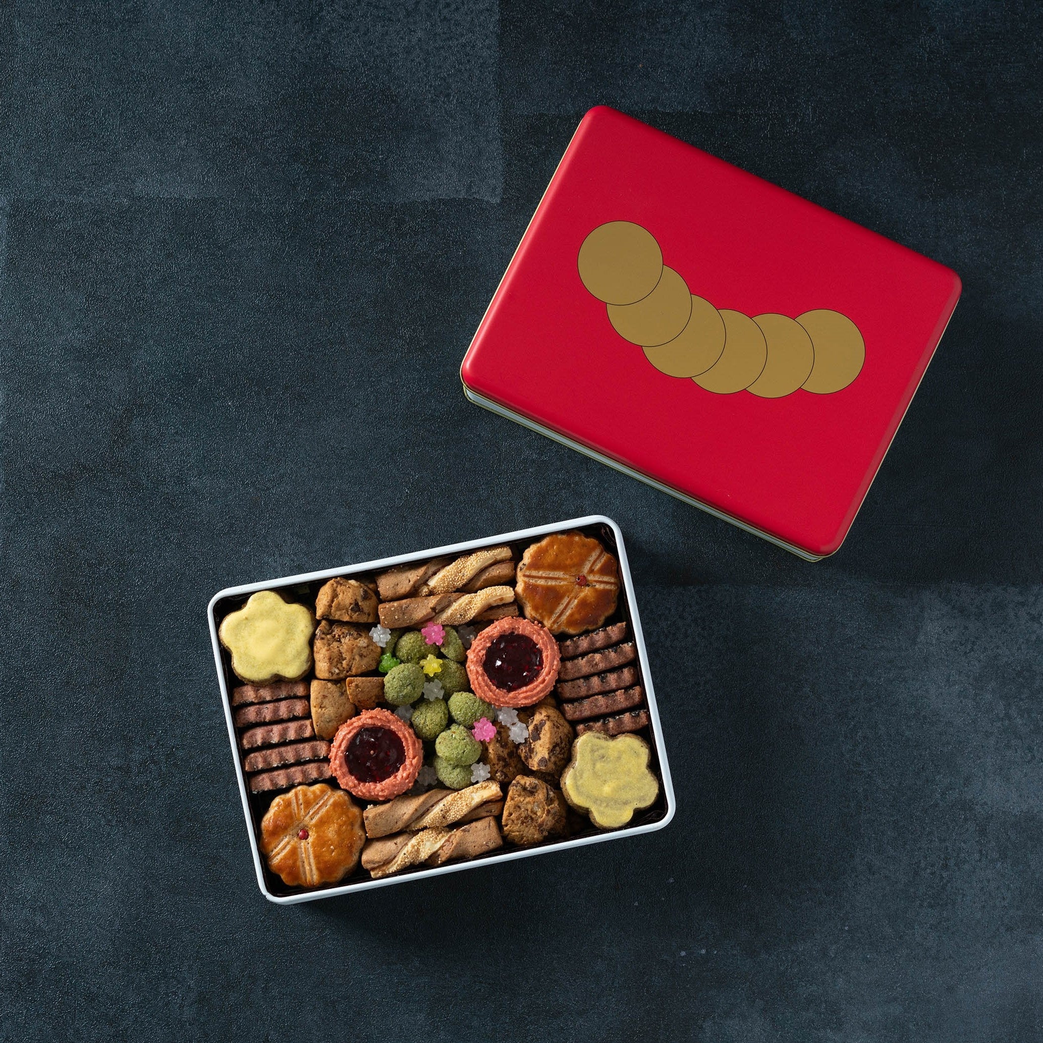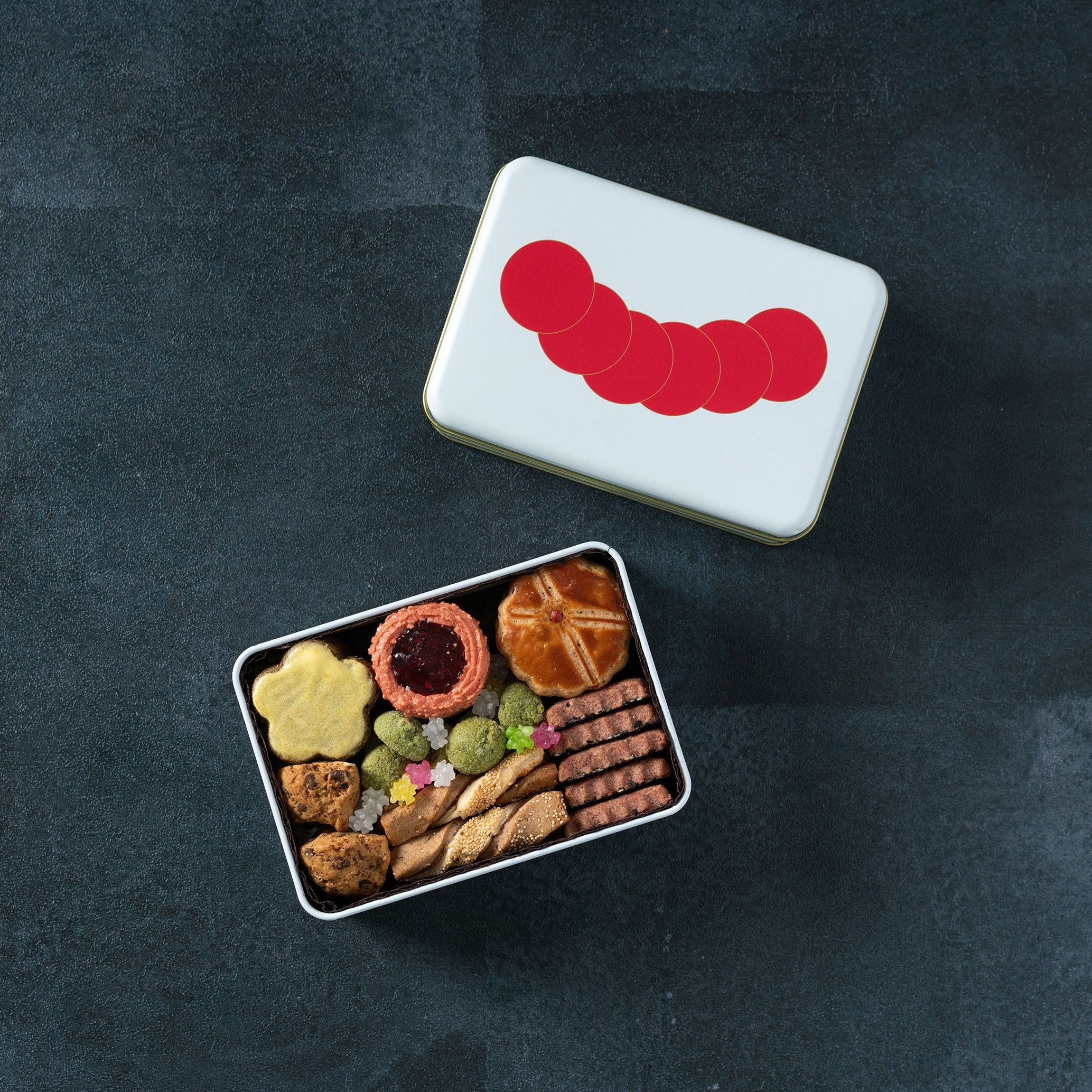 舌で感じる5つの味に「楽しみ」をプラスした「六味」をコンセプトに、ひとつひとつ丁寧に作り上げた和素材の焼菓子たちを詰め合わせたクッキー缶。