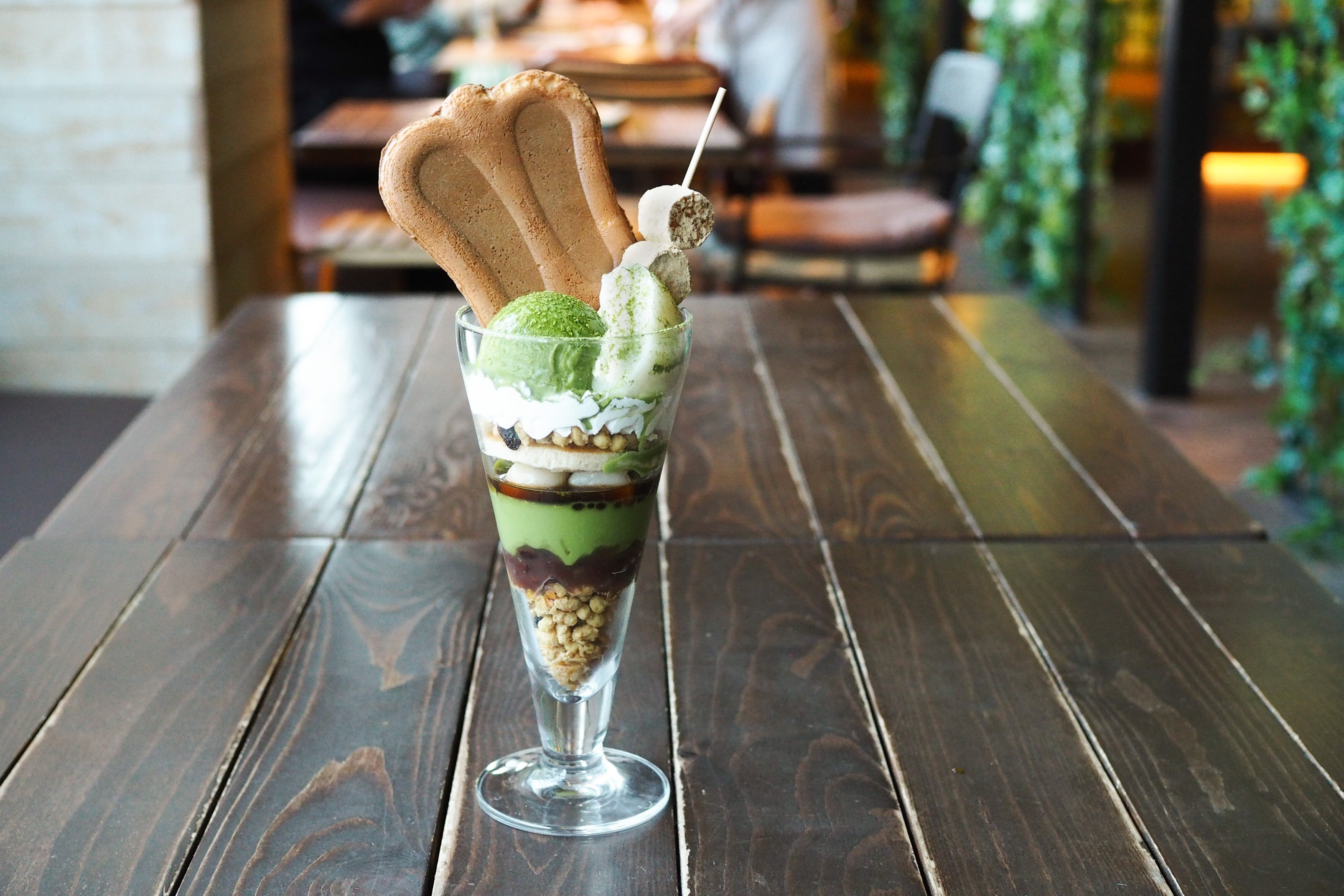 3つの熊谷銘菓と熊谷の新茶の風味を一度に楽しめる特別なパフェです。軍配せんべいでアイスクリームをすくって食べるも良し、個々に味わうも良し……食べ方は十人十色です。おふろcafe ハレニワの湯だからこそ生まれた、このオリジナルパフェをぜひご賞味ください。