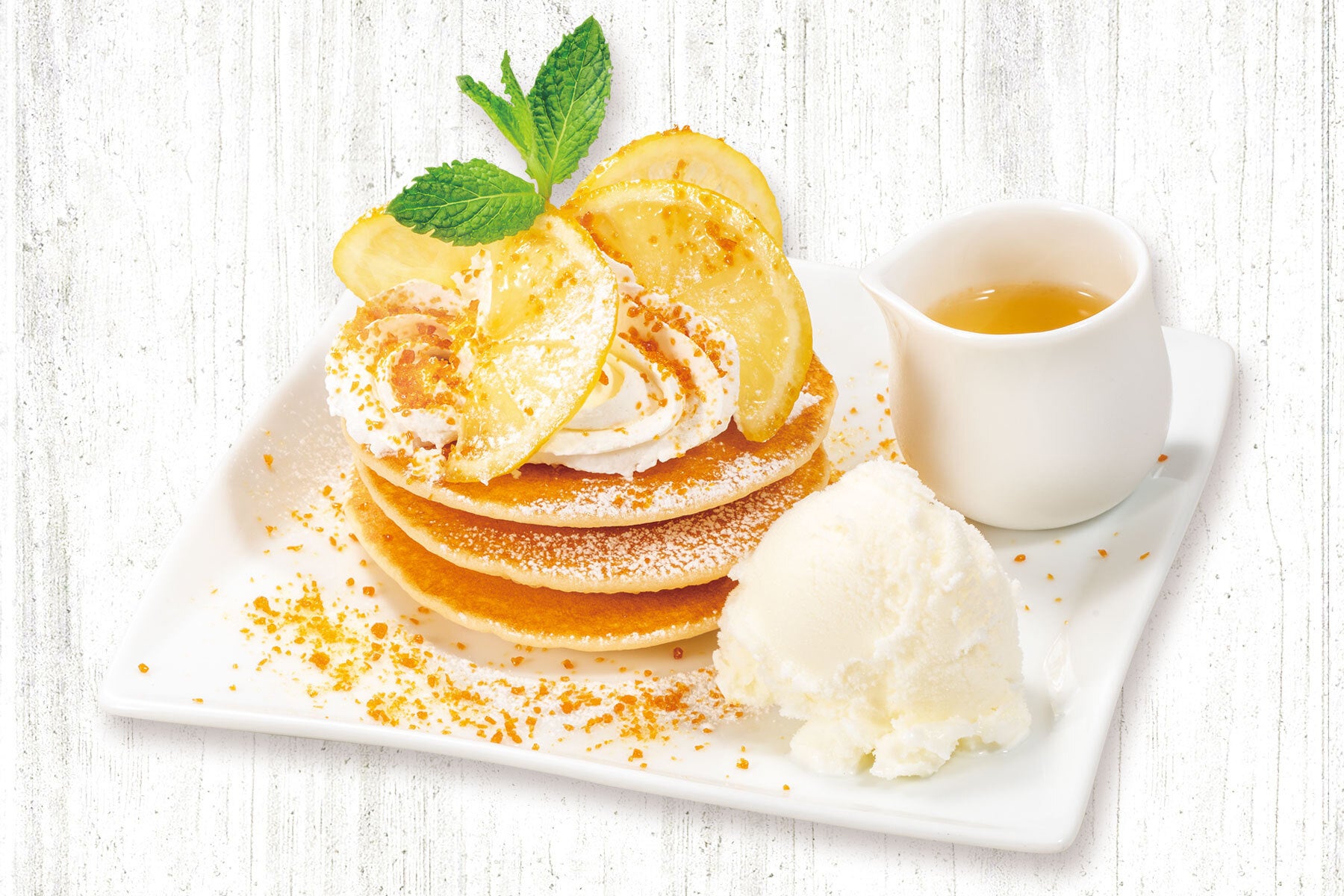 もちもち食感のミニパンケーキにたっぷりのホイップクリームと自家製ハニーれもんを盛り付けました。夏を表現したような、はちみつレモンの黄色とホイップクリームの白色が良く映えるデザートです。パンケーキとハニーれもんシロップの組み合わせは素朴でありながら、すっきりとした爽やかな味わいです。一緒に添えたミルクジェラートにもシロップをかけてお召し上がりください。