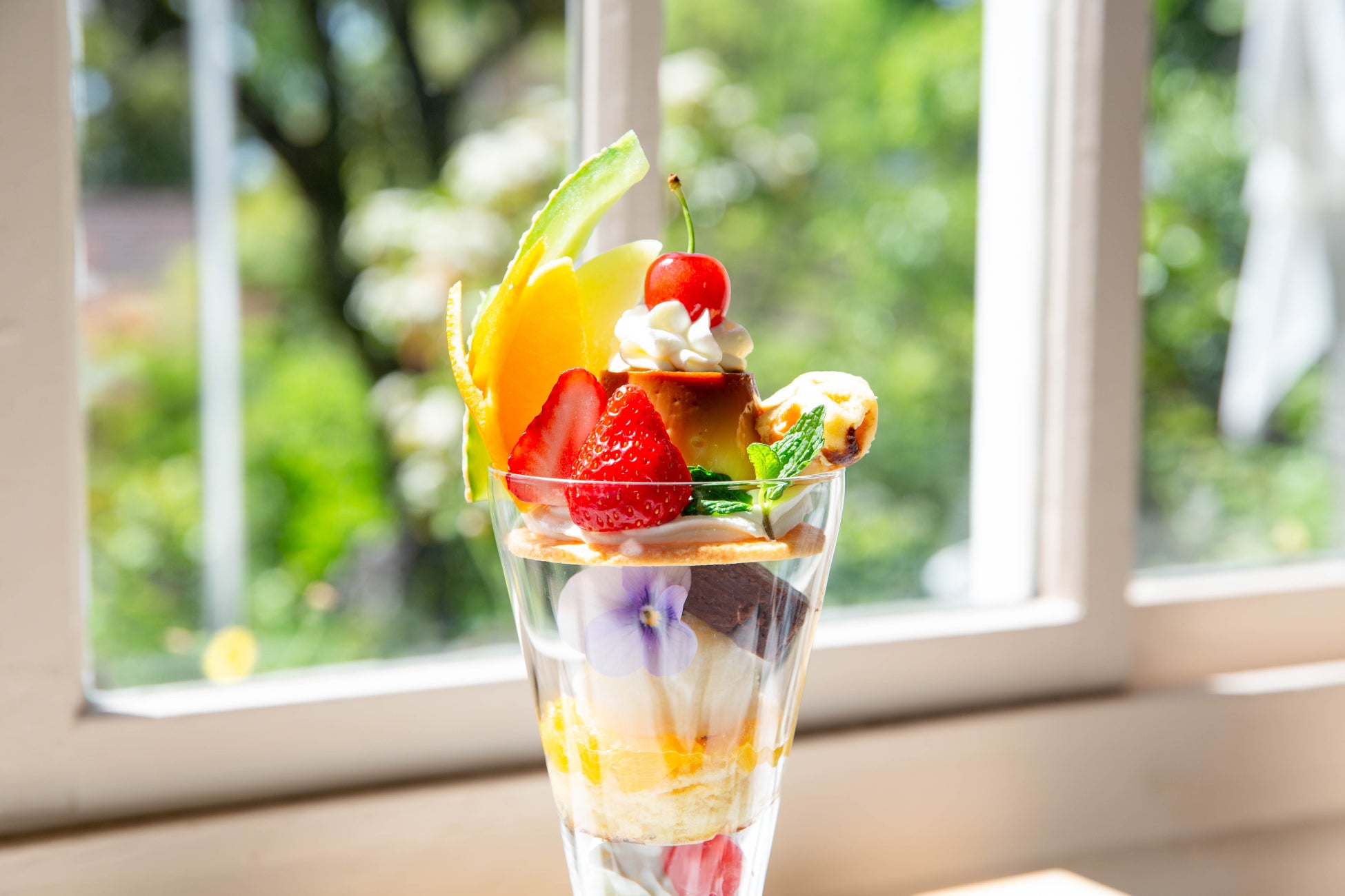 昔ながらのしっかりとしたプリンと旬のフルーツで贅沢に飾ったレトロなパフェ
