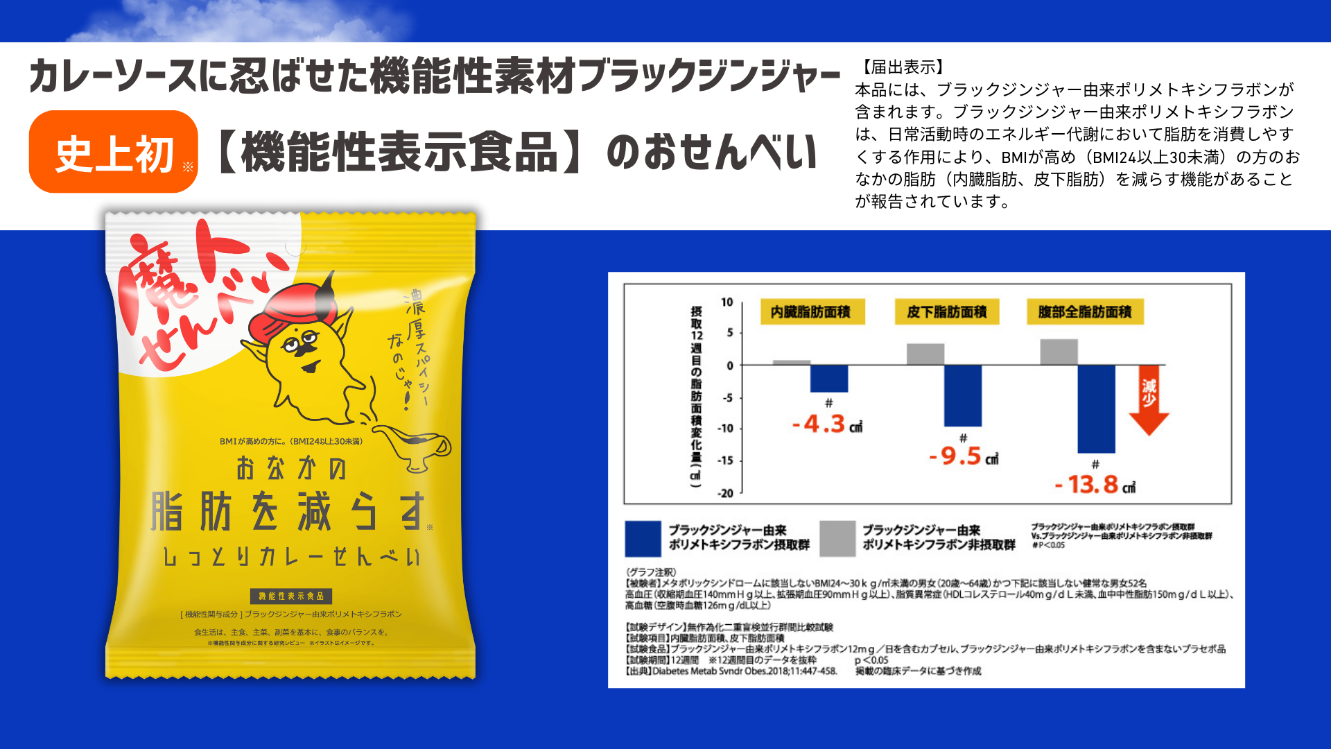 (2)商品概要 おなかの脂肪(内臓脂肪、皮下脂肪)を減らすブラックジンジャー配合の日本初*の機能性表示食品のカレーせんべい。