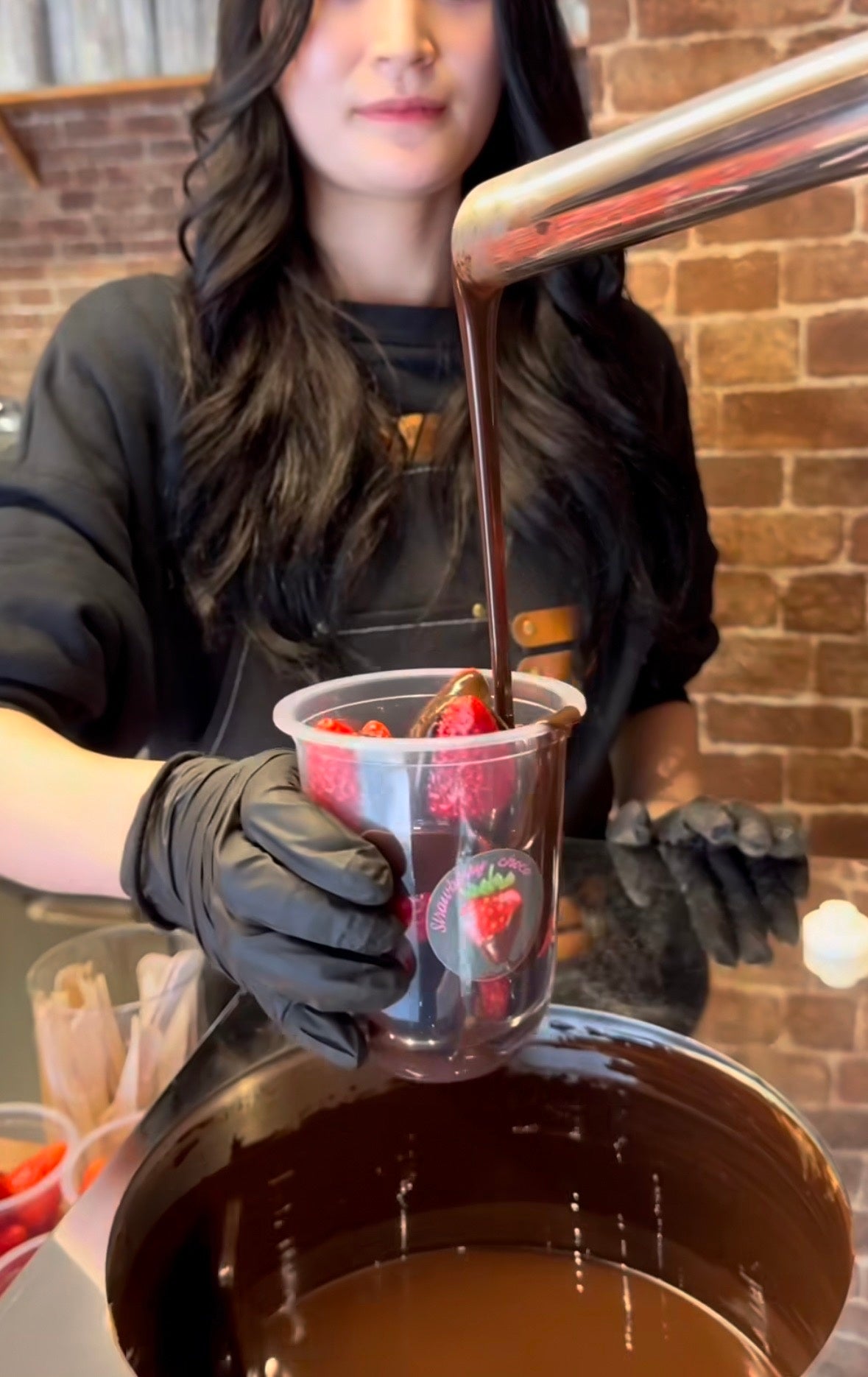苺は毎朝、市場にて選別して仕入れる高級な品種のみを使用、チョコレートは苺の品種に合わせて溶解していく。