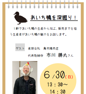 6月30日(日)は、「あいち鴨を深掘り!」です。生産から加工、販売までを担う市内の㈲鳥市精肉店の市川勝丸代表取締役があいち鴨の魅力を語ります。いずれも午後1時半から1時間の予定で、会場は中央図書館3階第2・3会議室です。